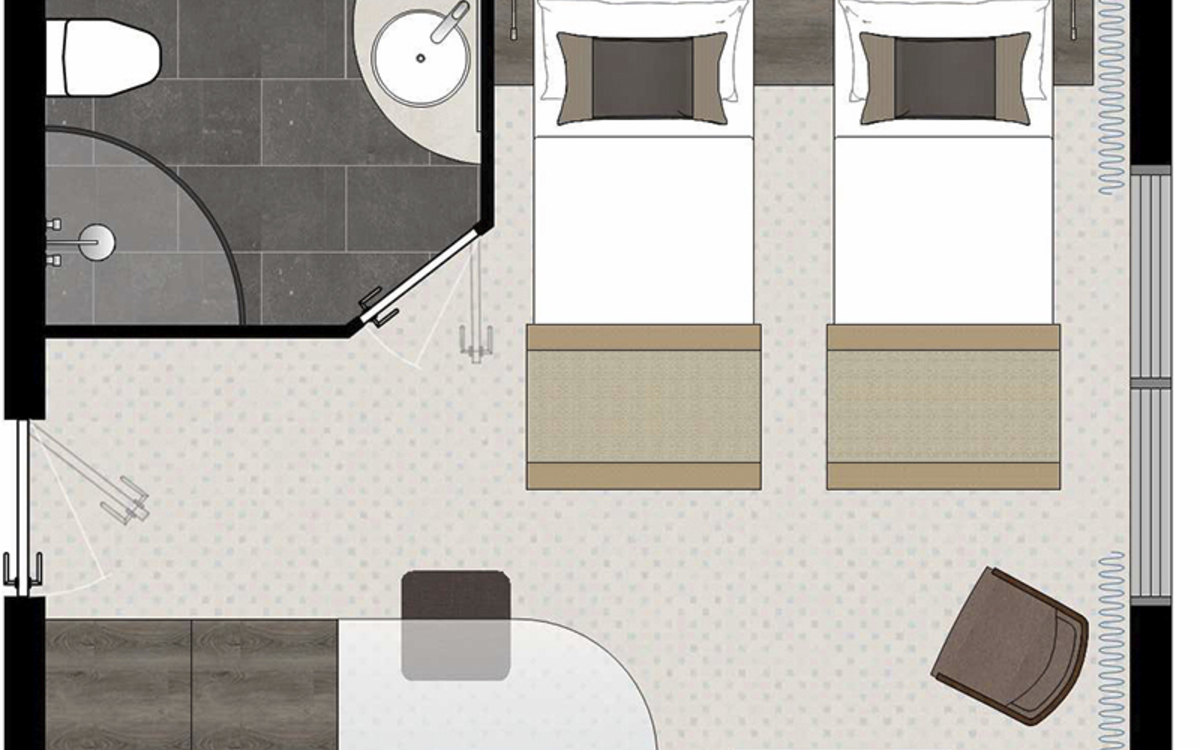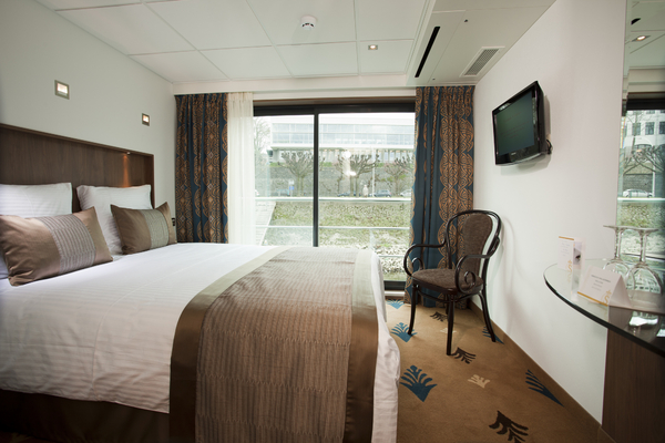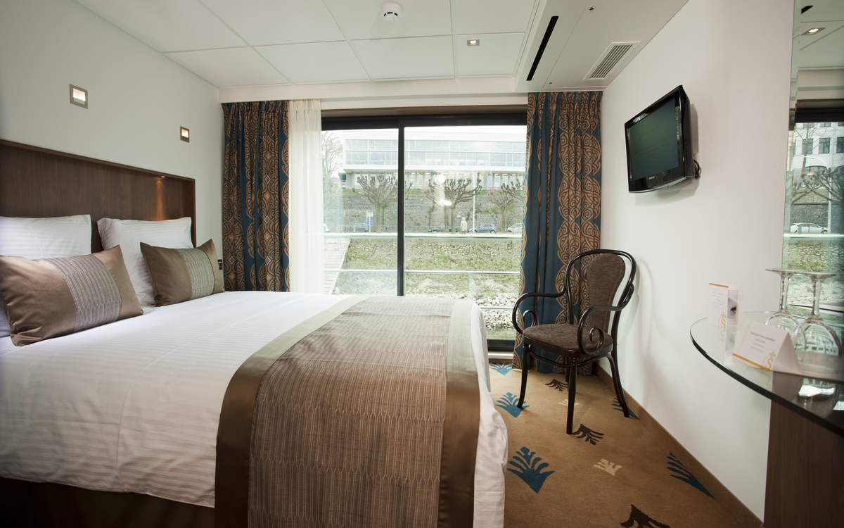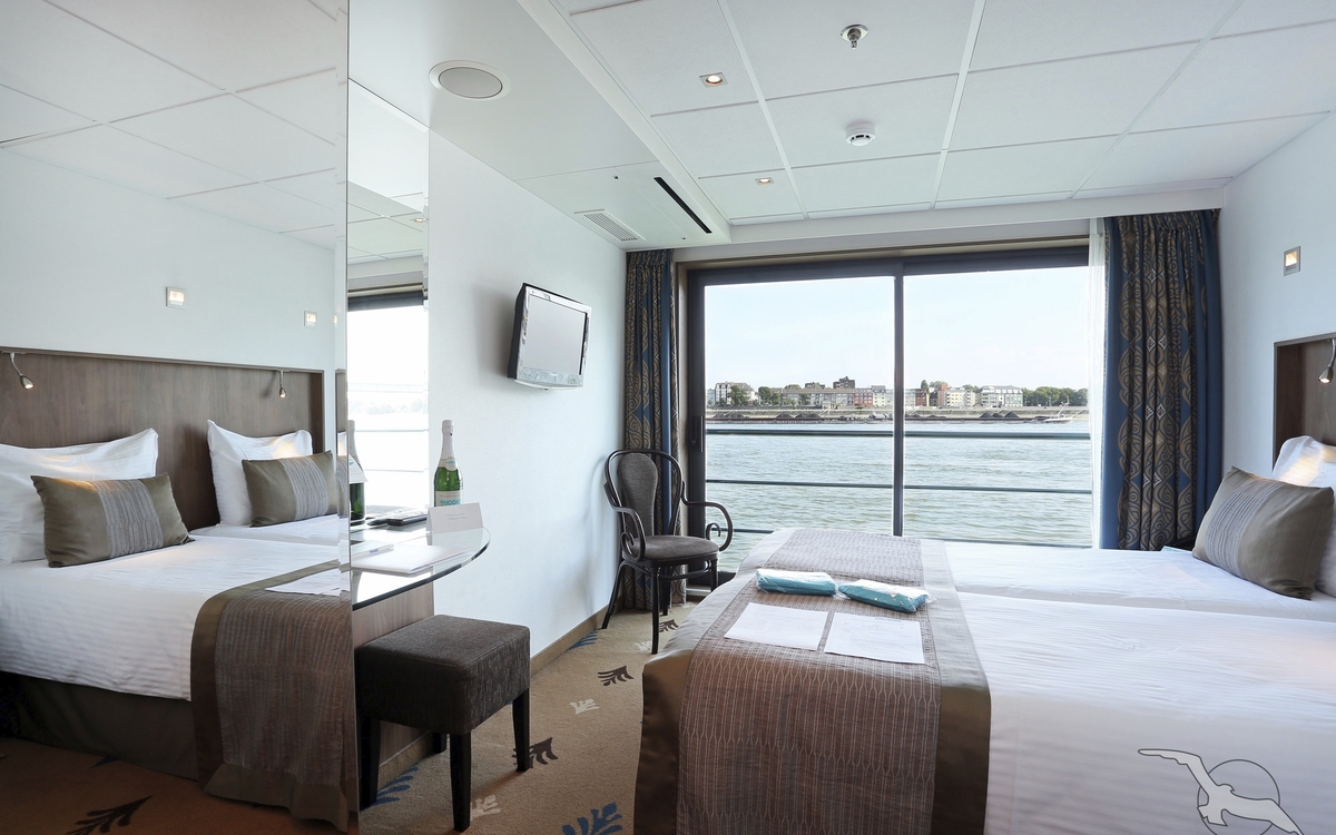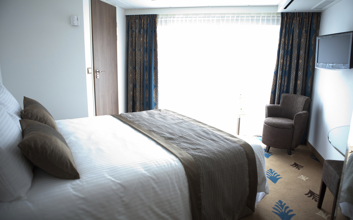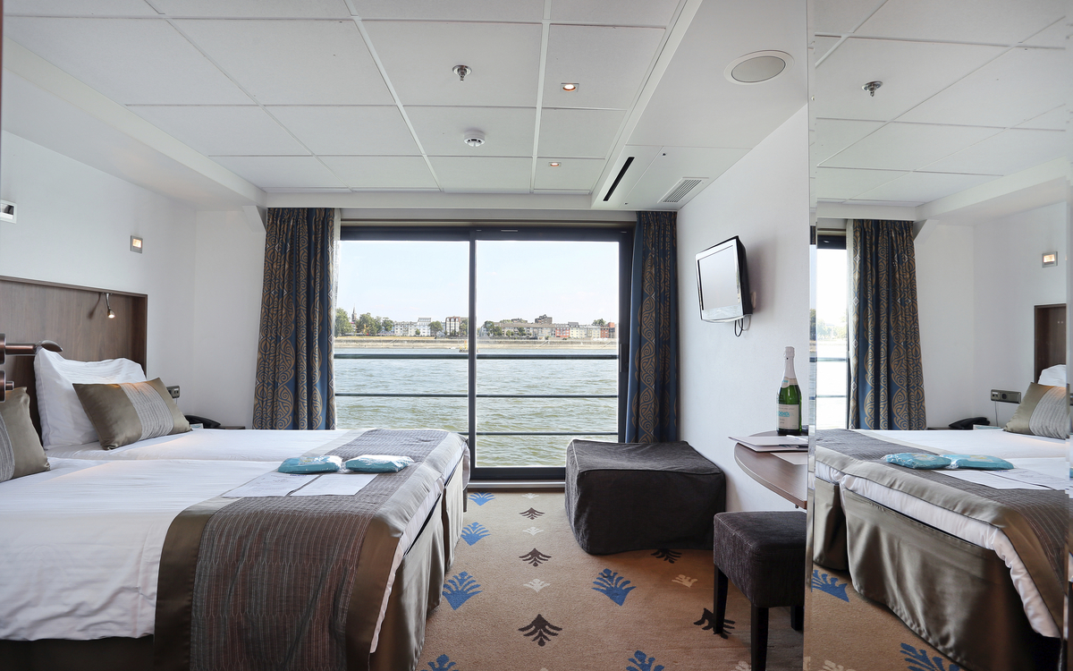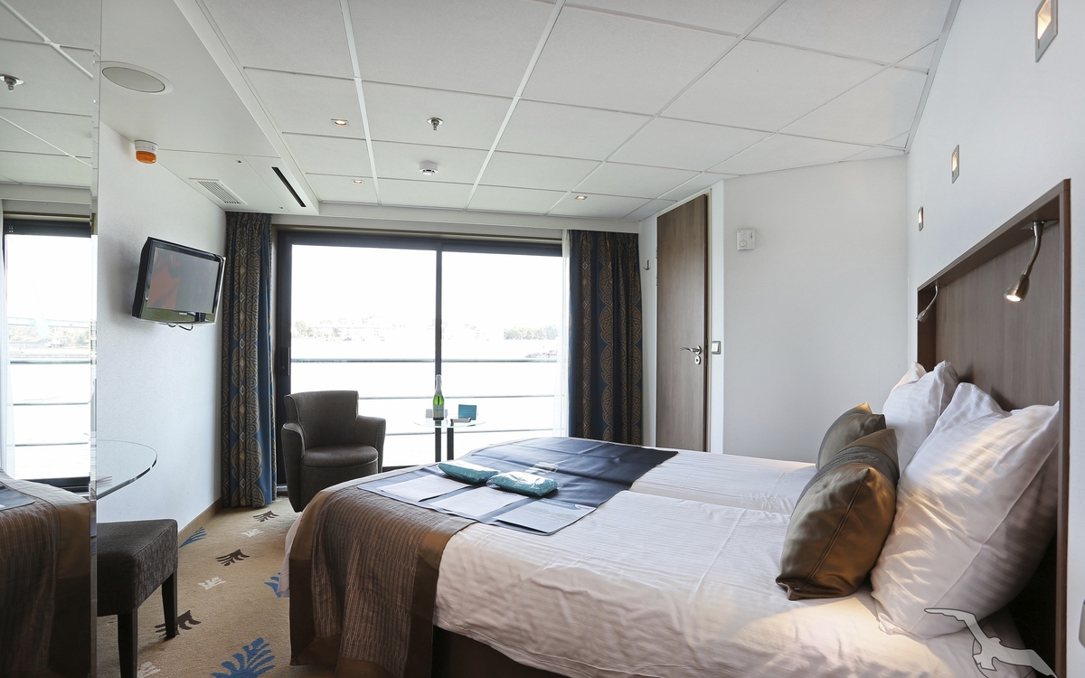 Alle Kabinen liegen außen, sind komfortabel und elegant eingerichtet mit französischem Balkon, raumhoher Fensterfront und Schiebetür. Die Betten lassen sich wahlweise als Doppel- oder Einzelbetten stellen.
