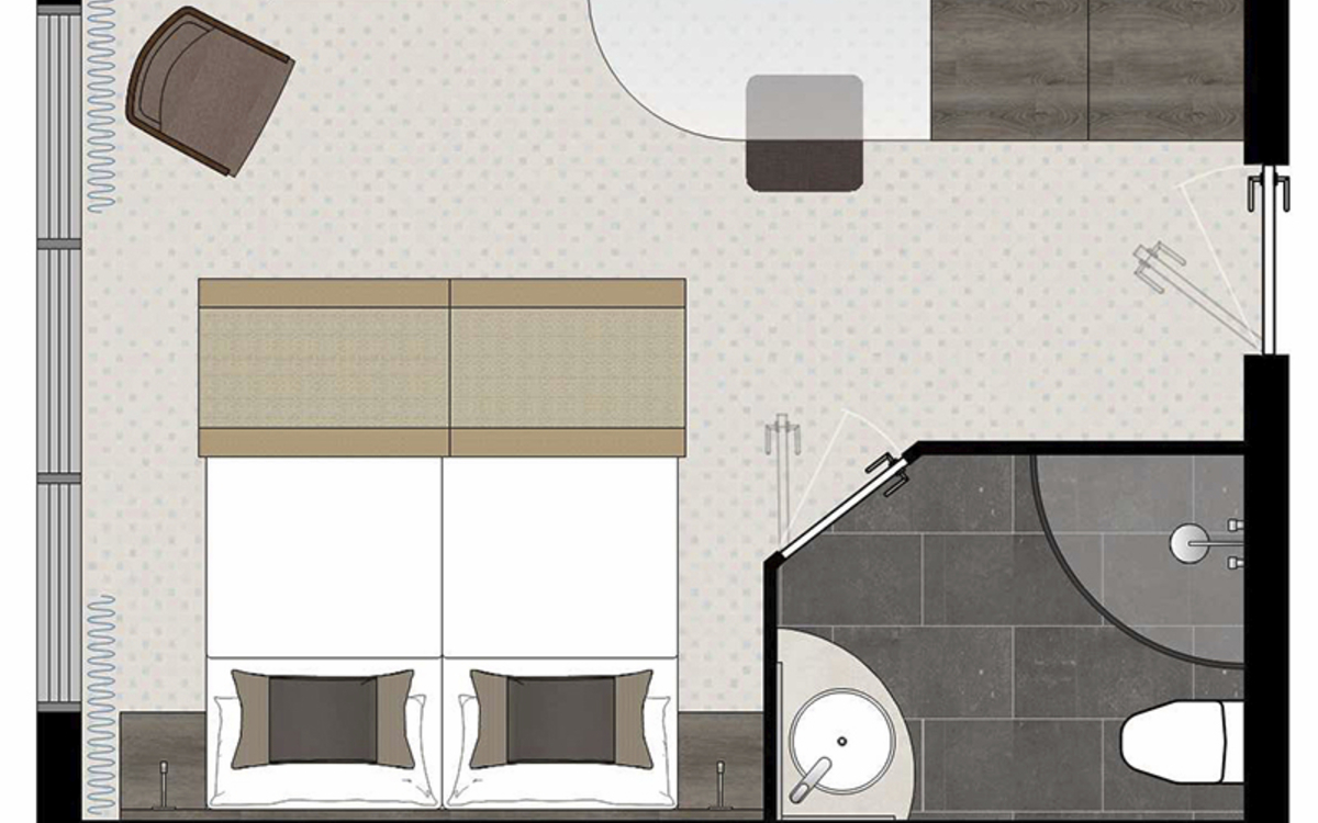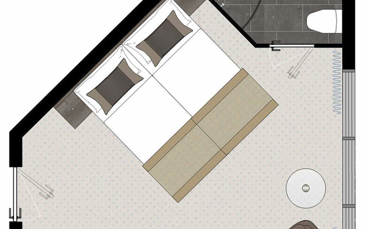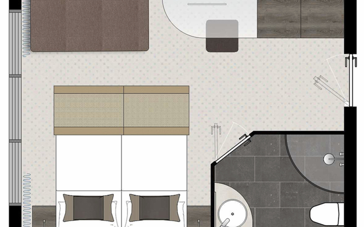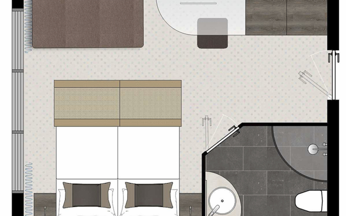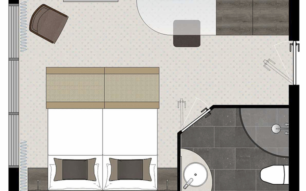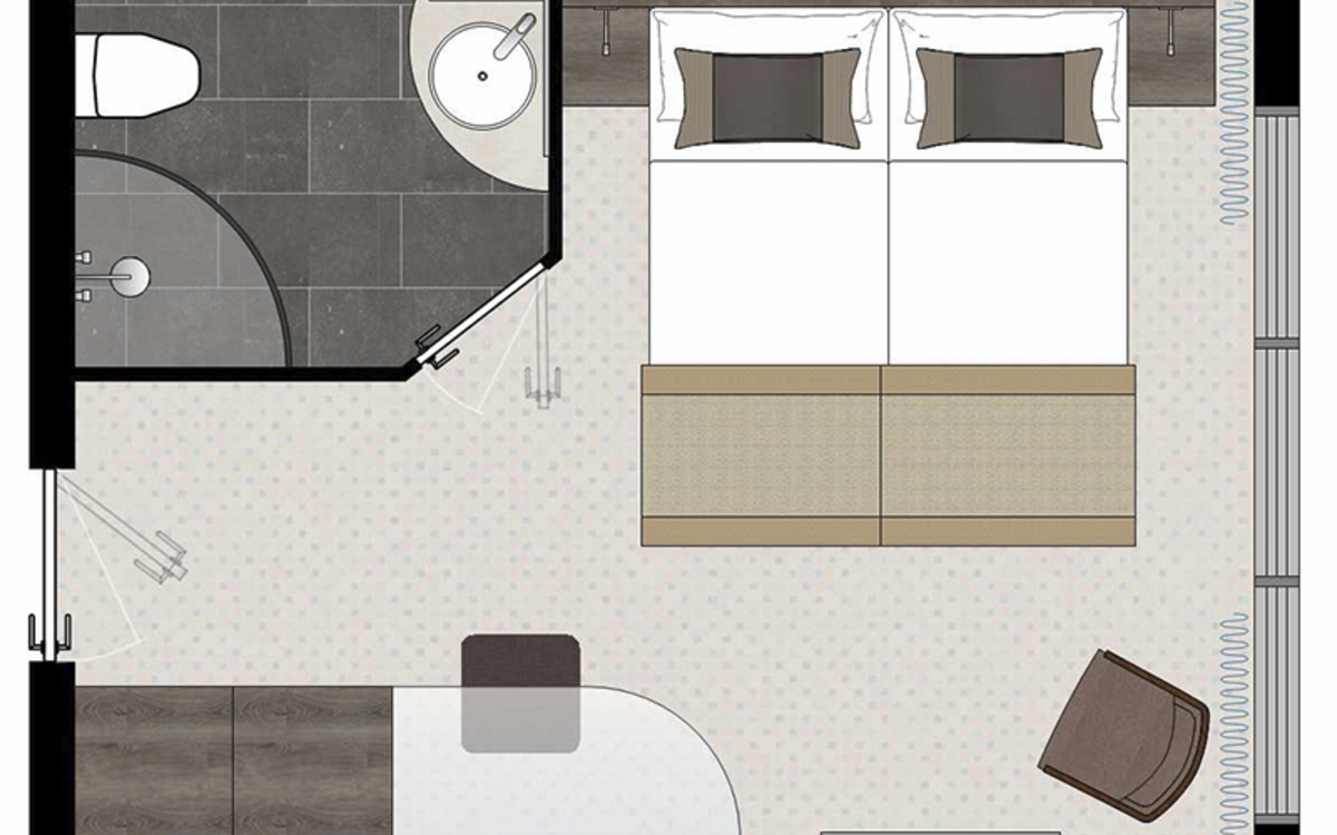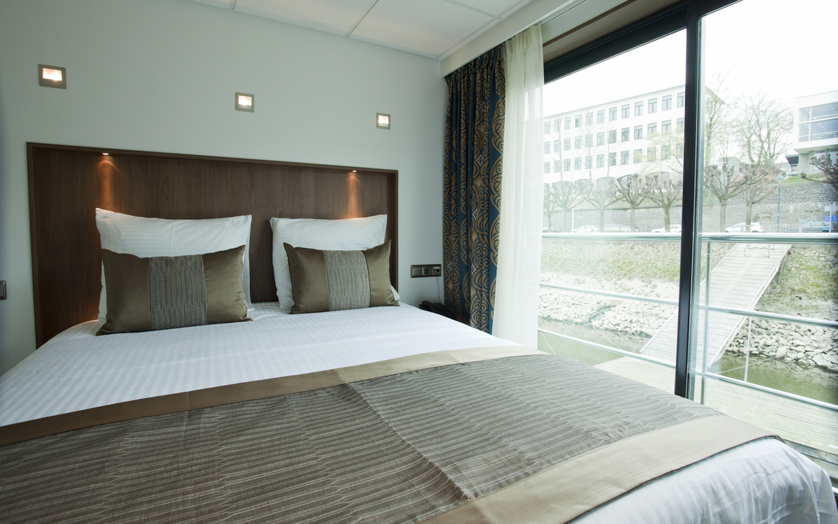 Alle Kabinen liegen außen, sind komfortabel und elegant eingerichtet mit französischem Balkon, raumhoher Fensterfront und Schiebetür. Die Betten lassen sich wahlweise als Doppel- oder Einzelbetten stellen.