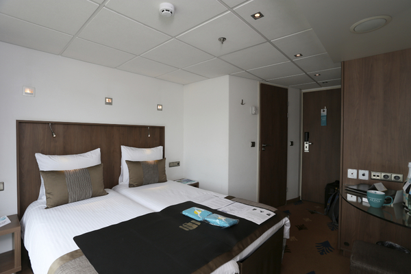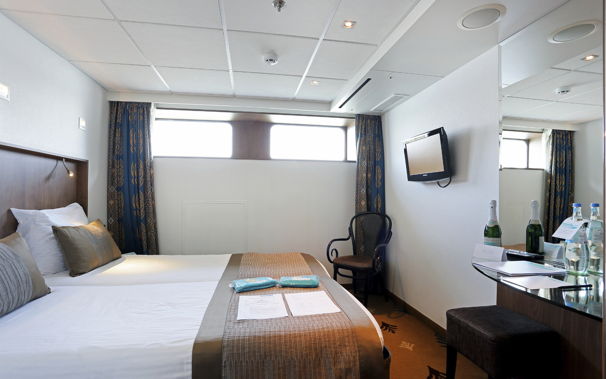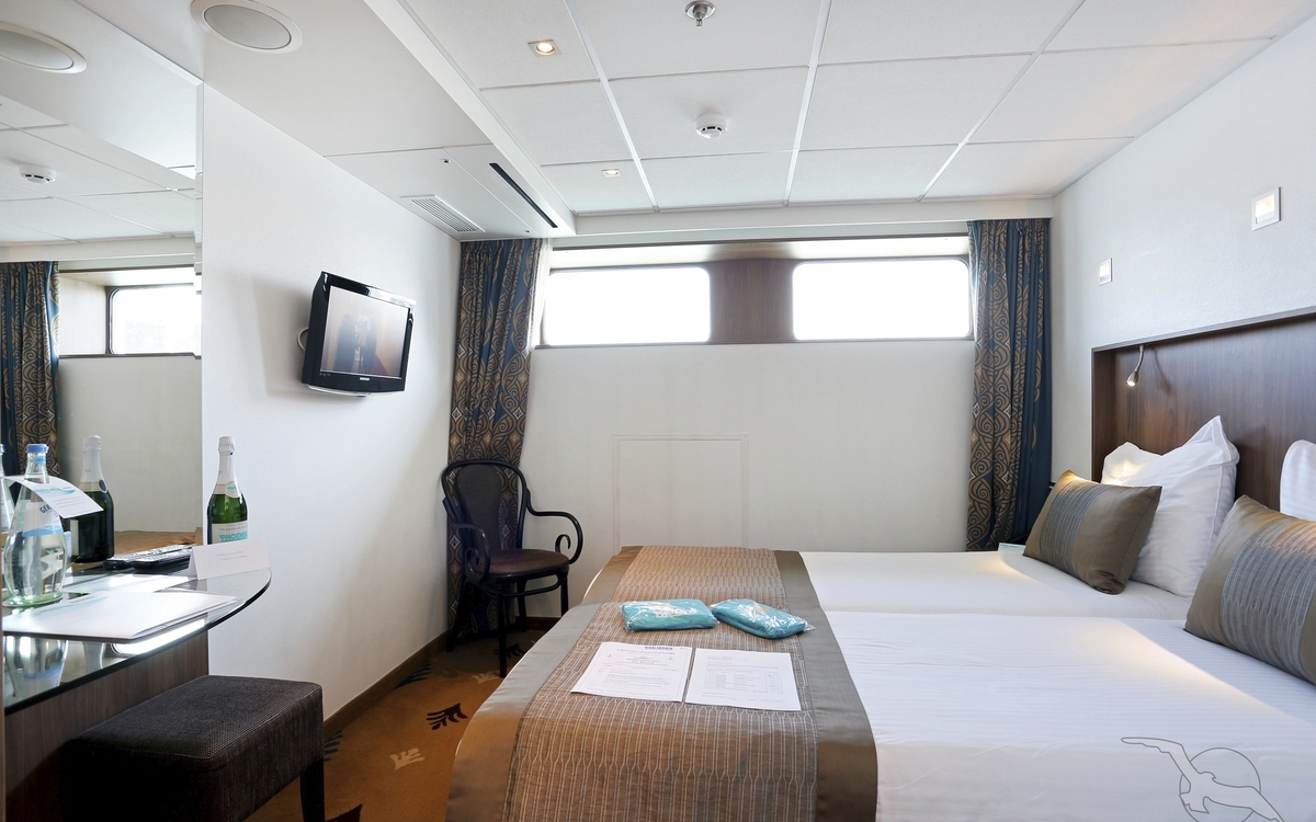 Alle Kabinen liegen außen, sind komfortabel und elegant eingerichtet. Die Betten lassen sich wahlweise als Doppel- oder Einzelbetten stellen. Dusche/WC, Fön, individuell regulierbare Klimaanlage, SAT-TV (Flachbildschirm), Radio, Minibar, Safe, Telefon, Stromspannung 220 V Wechselstrom. Kabinengröße ca. 14 qm.