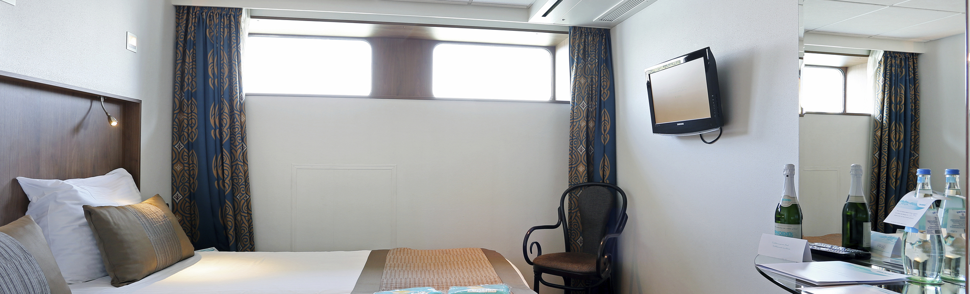 Alle Kabinen liegen außen, sind komfortabel und elegant eingerichtet mit kleinen Fenstern, die aus Sicherheitsgründen nicht zu öffnen sind. Die Betten lassen sich wahlweise als Doppel- oder Einzelbetten stellen. Lage der Kabinen im hinteren Bereich des Schiffes, bei fahrendem Schiff verstärkte Maschinengeräusche.