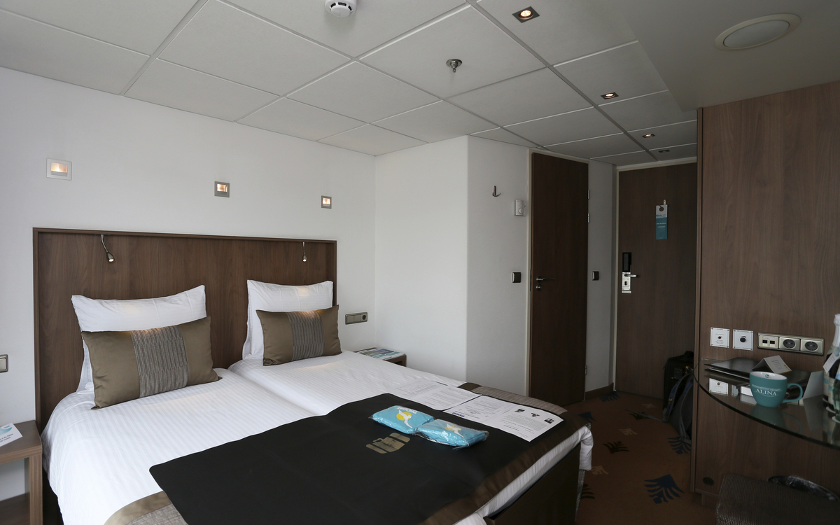 Ausstattung: Dusche/WC, Föhn, individuell regulierbare Klimaanlage, SAT-TV, Radio, Minibar, Safe, Telefon, kleine Tageszeitung, Bordspannung 230 V Wechselstrom. Die Betten lassen sich wahlweise als Doppel- oder Einzelbetten stellen