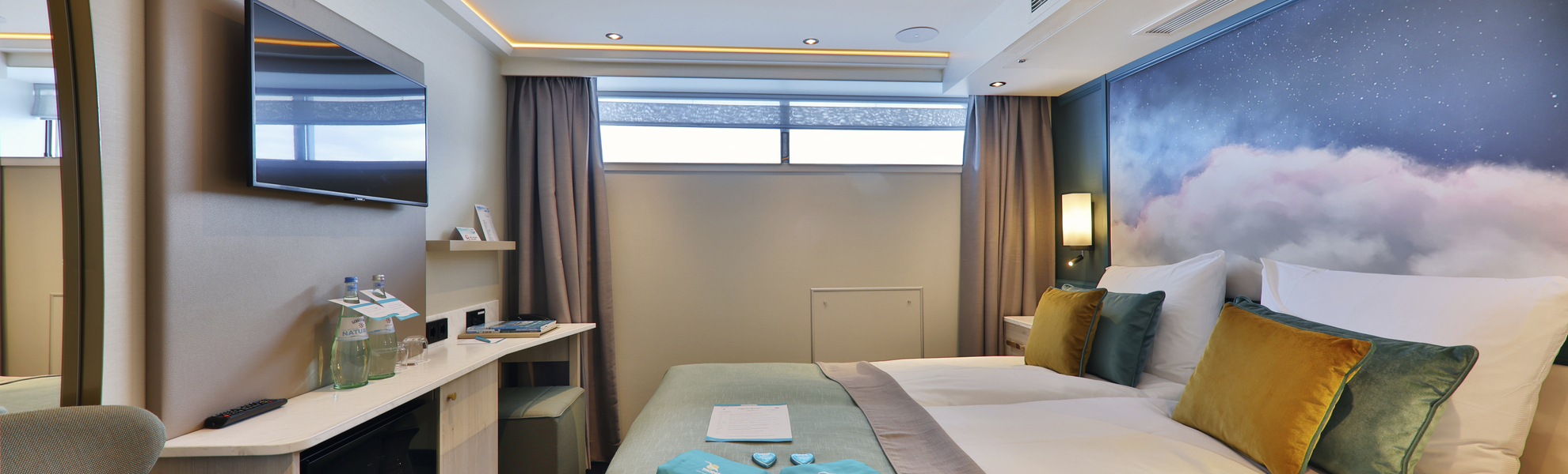 Alle Kabinen liegen außen, sind komfortabel und elegant eingerichtet. Die Kabinen auf dem Orion- und Saturndeck mit französischem Balkon, auf dem Neptundeck mit kleinen Fenstern (nicht zu öffnen).