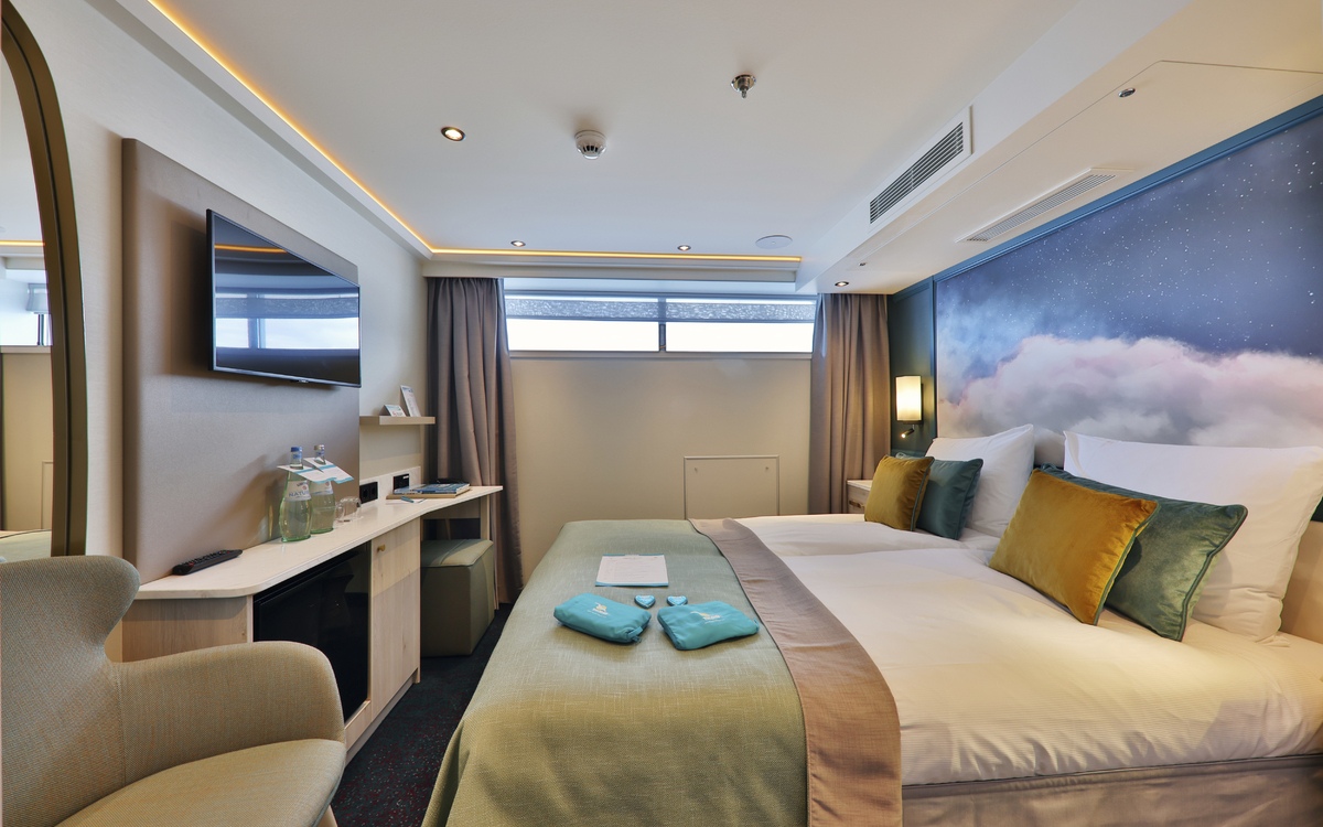 Alle Kabinen liegen außen und sind komfortabel und luxuriös eingerichtet und haben einen französischen Balkon. Die Betten lassen sich wahlweise als Doppel- oder Einzelbetten stellen.
