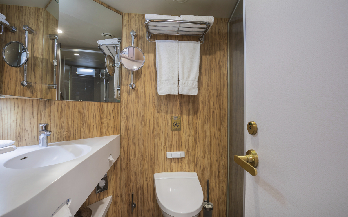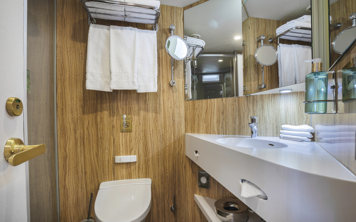 Bademäntel in jeder Kabine zur Benutzung an Bord. Handtücher und Badelaken werden auf Wunsch täglich gewechselt. Die Fenster/Bullaugen lassen sich nicht öffnen. Die Superiorkabinen und Suiten verfügen über einen Privatbalkon.