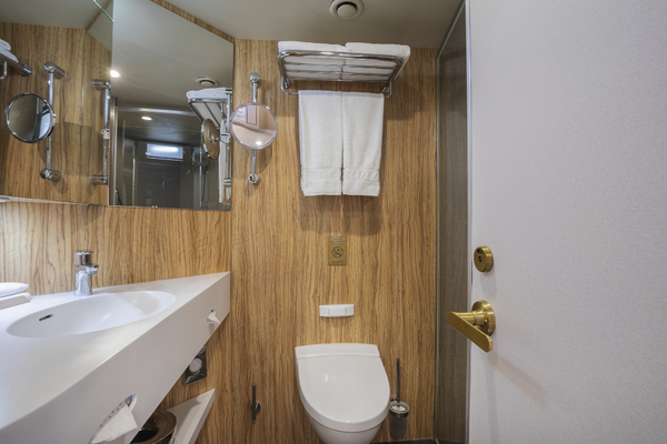 Ausgestattet mit Tisch und Sessel (kann bei Bedarf entfernt werden), 2 Doppelschränke, Spiegelkommode mit mehreren Schubfächern, Dusche/WC, Duschgel/Schampoo, Bademantel, Fön, SAT-TV (Empfang abhängig vom Fahrgebiet), individuell regulierbare Klimaanlage, Telefon, Safe, Minibar, Kaffemaschine (inklusive Kapseln), WLAN (nicht inkl., Empfang abhängig vom Fahrgebiet).