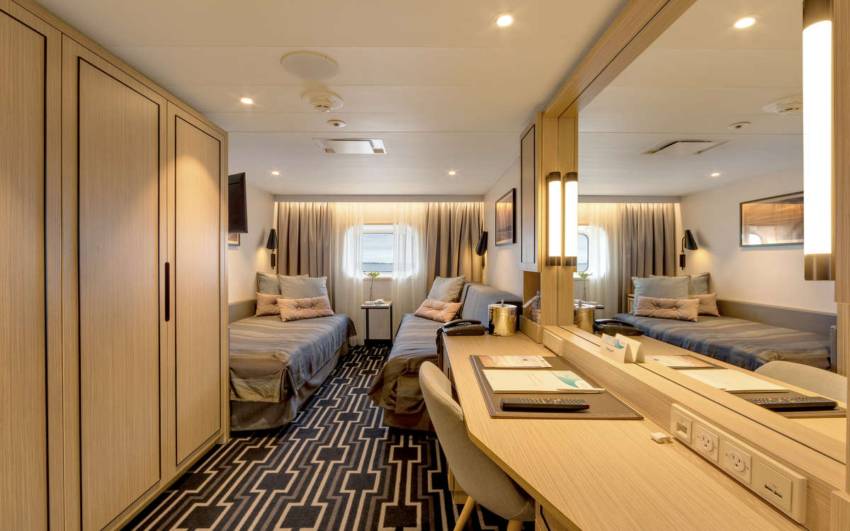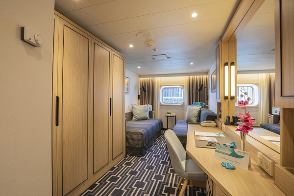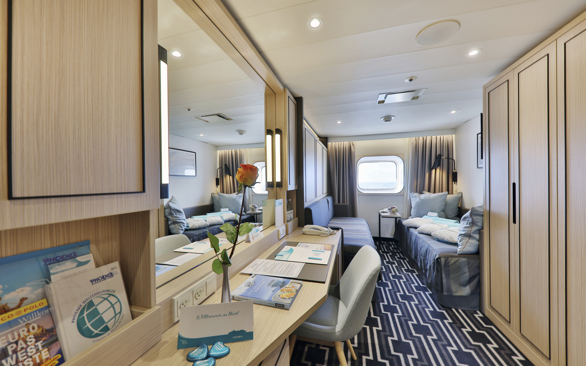 Diese 2-Bett-Außenkabinen auf dem Orion-Deck sind mit Fenster (nicht zu öffnen) ausgestattet. Die Kabinen verfügen über 2 untere Betten (auf Wunsch zusammenstellbar).