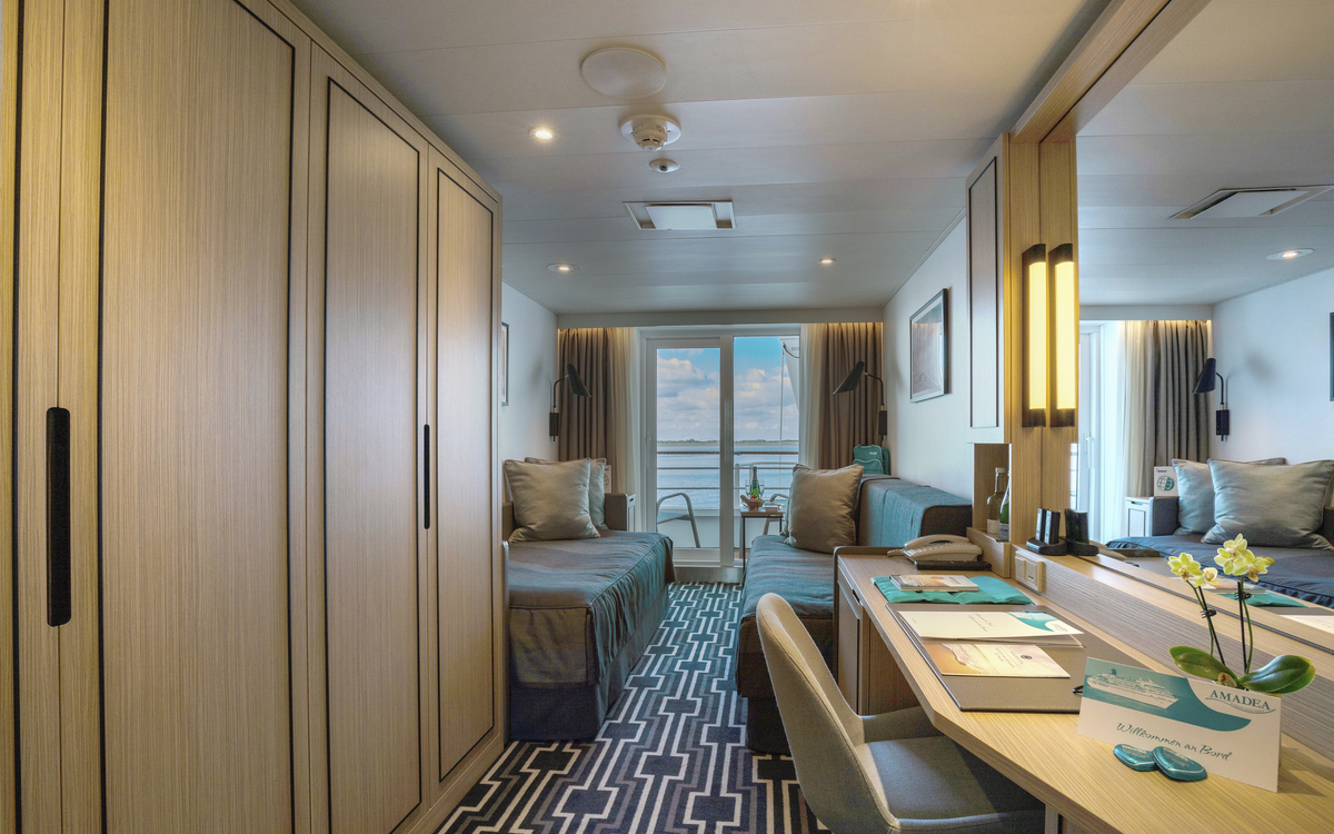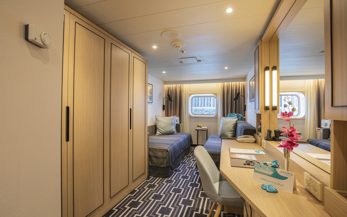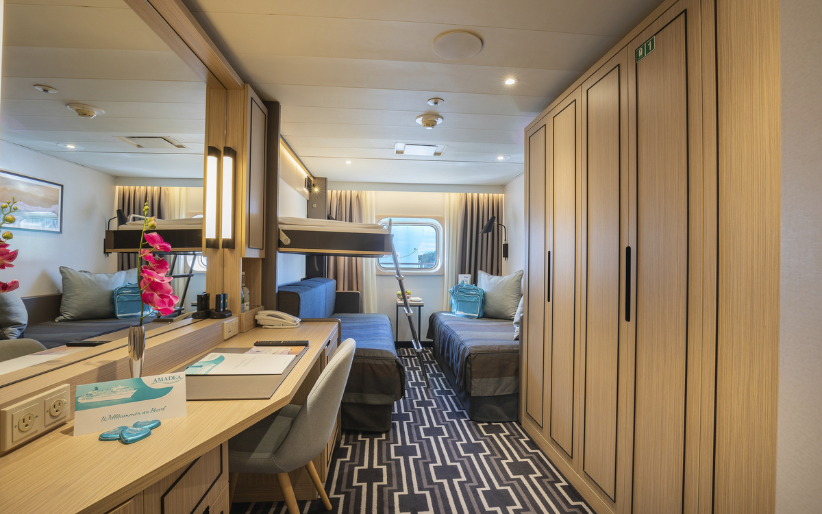Alle Kabinen der MS Amadea sind geräumig und sehr komfortabel ausgestattet und wurden 2021 und 2024 neu gestaltet. Die 2-Bett- und Superior-Kabinen verfügen über zwei untere Betten, die tagsüber als Couch genutzt werden können.