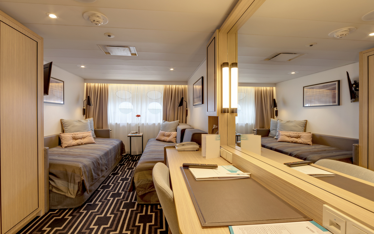 Diese 2-Bett-Kabinen liegen außen auf dem Oriondeck und verfügen über ein Fenster (nicht zu öffnen) und 2 untere Betten (auf Wunsch zusammenstellbar) und zusätzlich über ein einklappbares Oberbett.