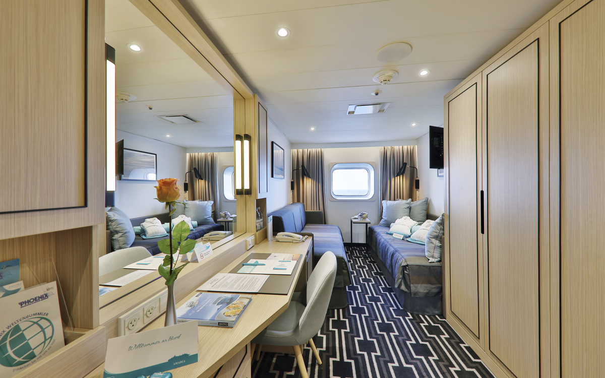 Diese 3-Bett-Kabinen mit Fenster (nicht zu öffnen, Spiegelverglasung) liegen außen auf dem Promenaden-Deck und verfügen über 2 untere Betten (auf Wunsch zusammenstelbar) und zusätzlich ein einklappbares Oberbett.