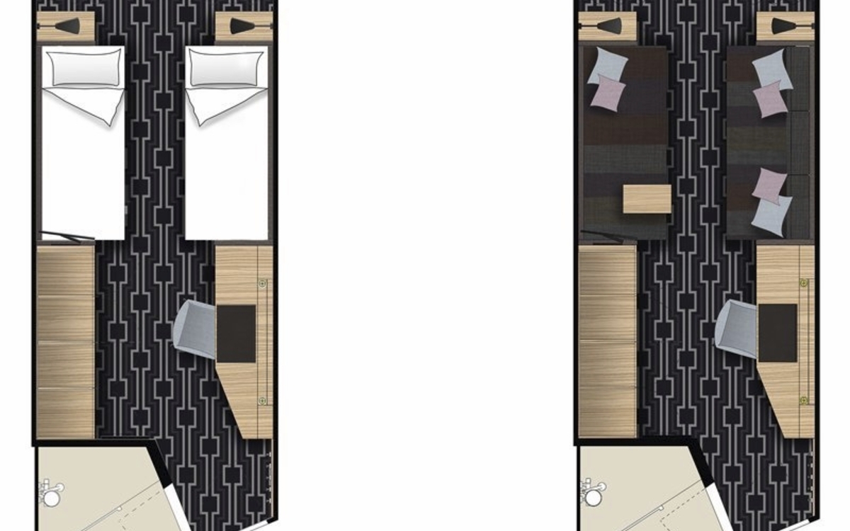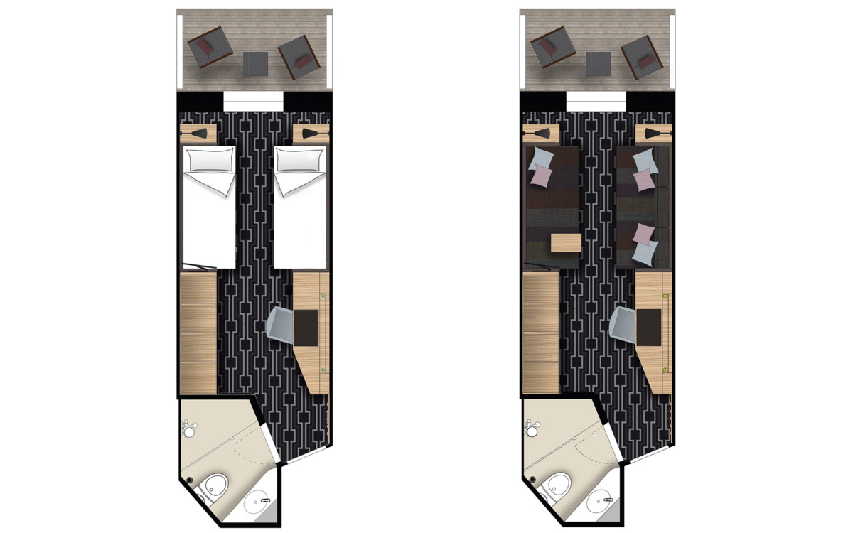 Diese 2-Bett-Kabinen zur Alleinbenutzung mit Privat-Balkon liegen außen auf dem Lido-Deck und verfügen über 2 untere Betten (auf Wunsch zusammenstellbar).