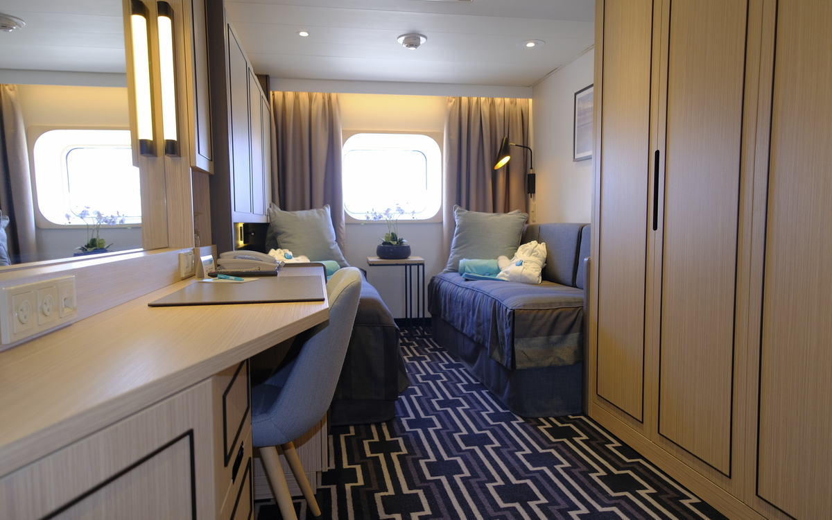 Die 2-Bett Außenkabinen ohne Sichtbehinderung sind mit zwei Bullaugen oder einem kleinen Fenster ausgestattet. Bullaugen und Fenster sind nicht zu öffnen. Sie verfügen über 2 untere Betten, 2 Doppelschränke, Spielgelkommode mit mehreren Schubfächern, Couchtisch mit Stuhl, Dusche/WC, TV, individuell regulierbare Klimaanlage, Safe, Minibar.