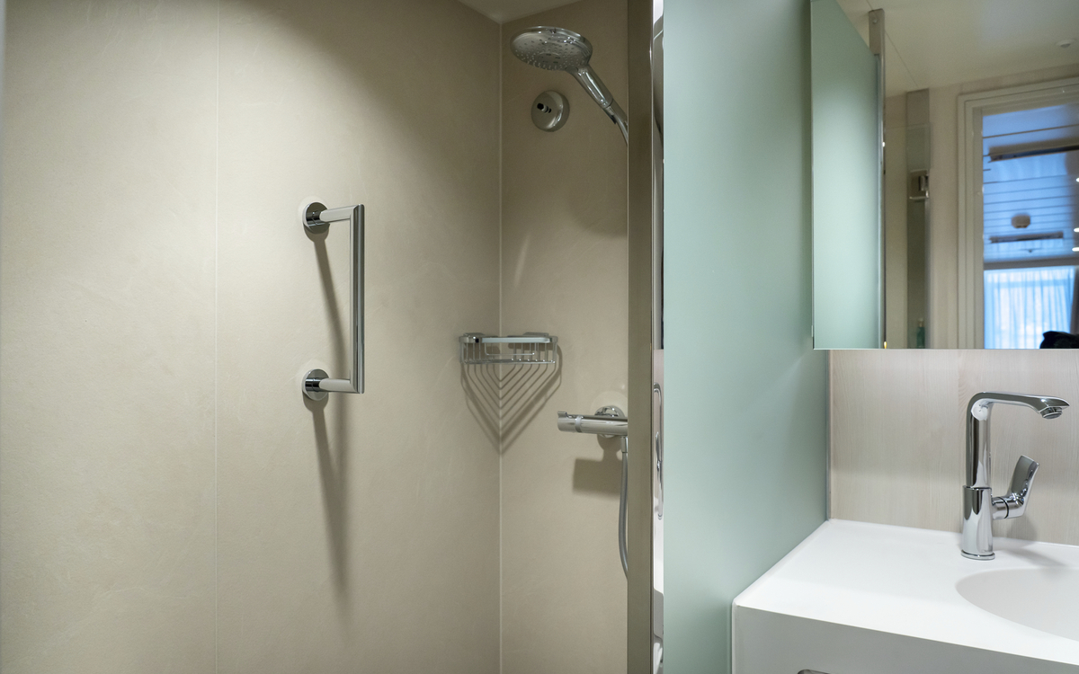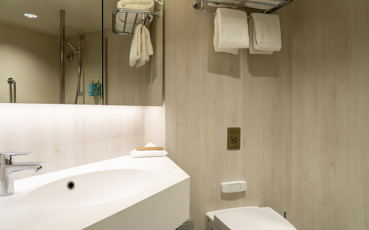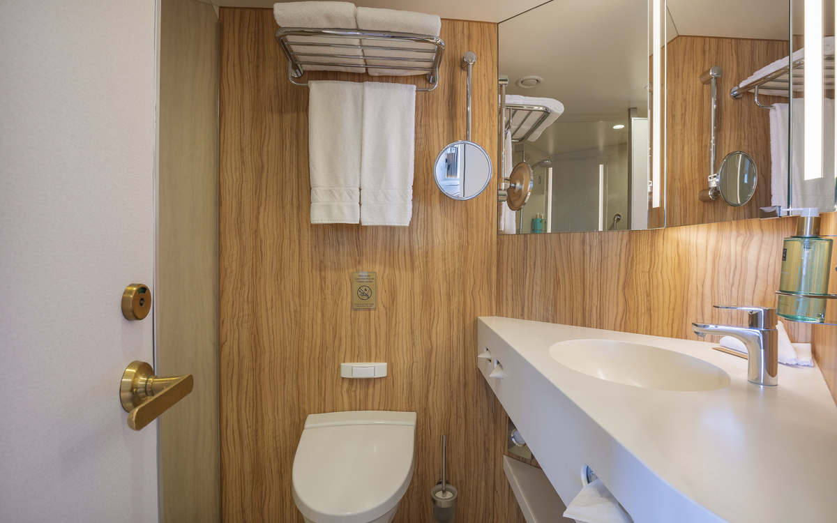 Es gibt 2 Doppelschränke, separates Schlafsofa (ausziehbar) mit Tisch und 2 Sesseln, Spiegelkommode mit mehreren Schubfächern, Dusche/WC, Duschgel/Schampoo, Bademantel, Fön, SAT-TV (Empfang abhängig vom Fahrgebiet), individuell regulierbare Klimaanlage, Telefon, Safe, Minibar, Kaffeemaschine (inklusive Kapseln), WLAN (nicht inkl., Empfang abhängig vom Fahrgebiet).