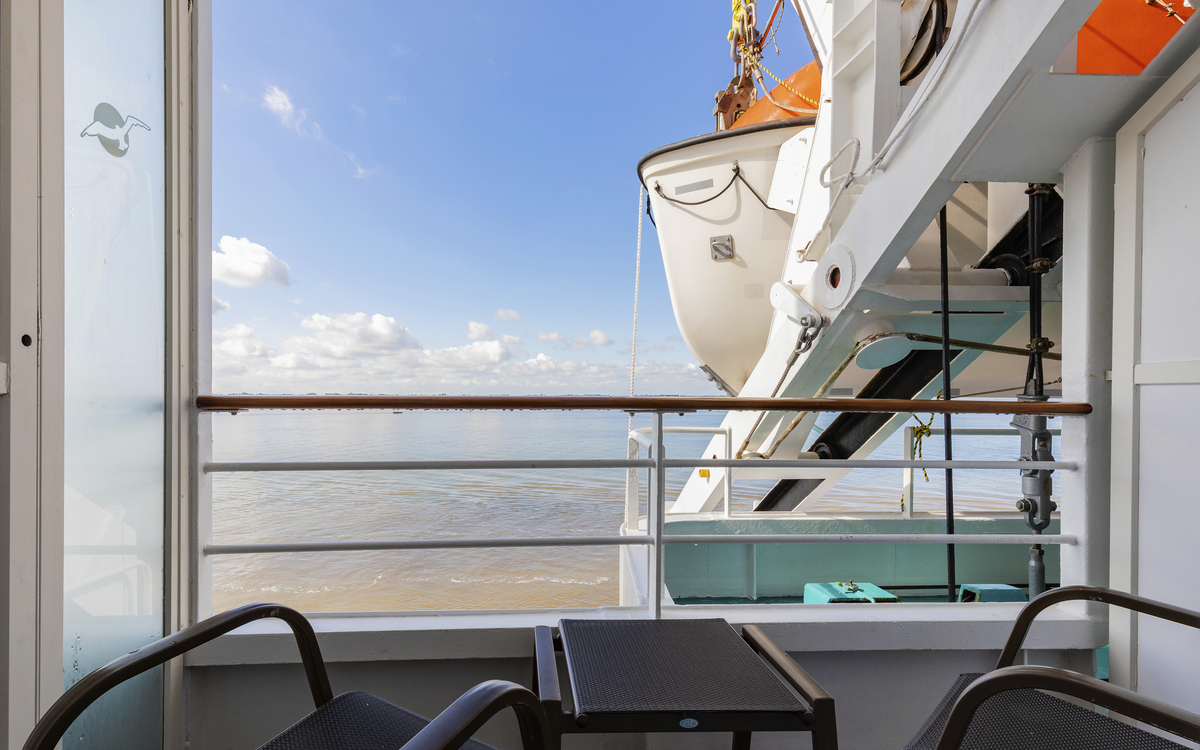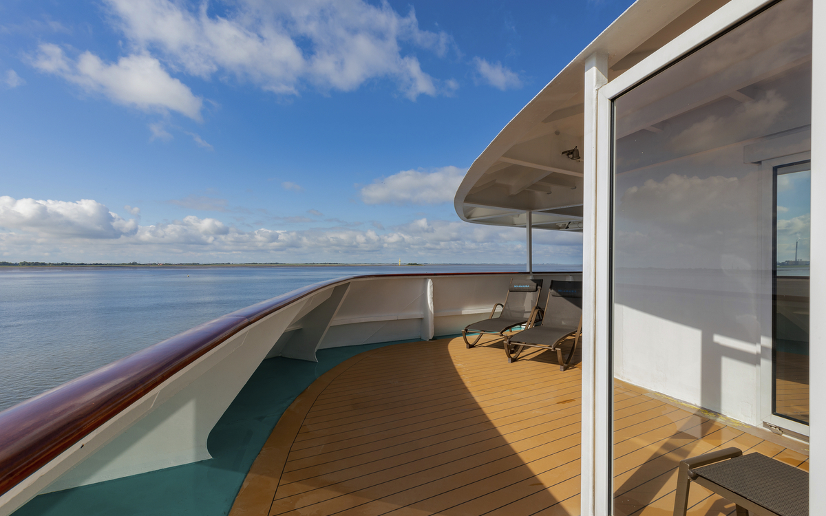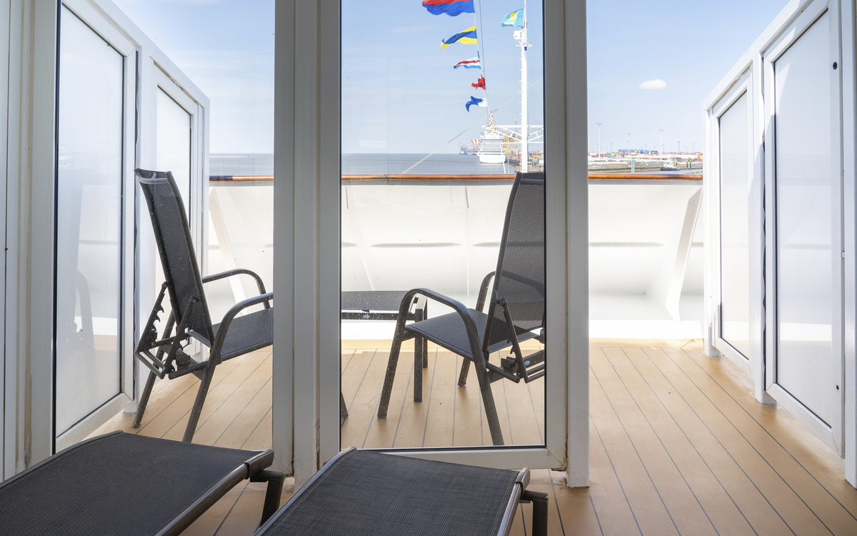 Großzügiger Balkon mit 2 Stühlen und kl. Tisch, Liegen und Windschutz. Das große Fenster mit Schiebetür wird aus Sicherheitsgründen bei schwerem Sturm von außen mit Sturm-Läden verschlossen, da die Kabinen vorne gelegen sind. Bei Dunkelheit müssen die Vorhänge von Tür und Fenster geschlossen werden.