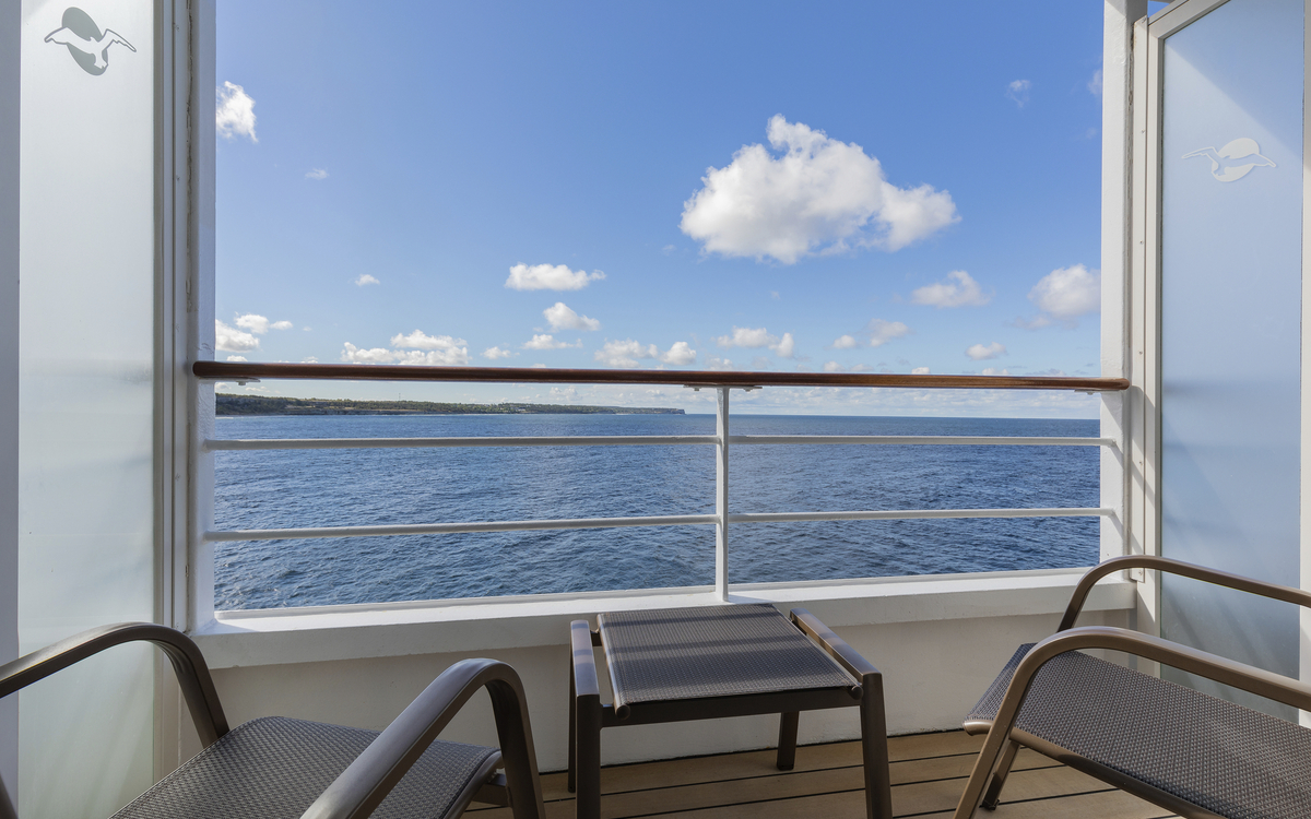 Großzügiger Balkon mit 2 Stühlen und kl. Tisch, Liegen und Windschutz. Das große Fenster mit Schiebetür wird aus Sicherheitsgründen bei schwerem Sturm von außen mit Sturm-Läden verschlossen, da die Kabinen vorne gelegen sind, bei Dunkelheit müssen die Vorhänge von Tür und Fenster geschlossen werden (außer Kabine 863).