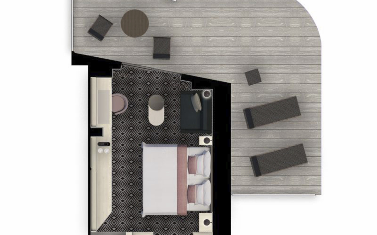 Diese 2-Bett-Spa-Junior-Suiten liegen unmittelbar am Spa und Wellnessbereich außen auf dem Panorama-Deck. Der große Privat-Balkon ist mit einem beheizbaren Whirlpool ausgestattet.