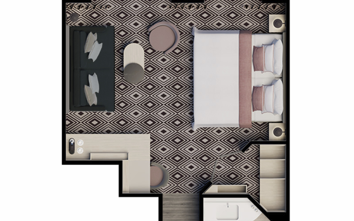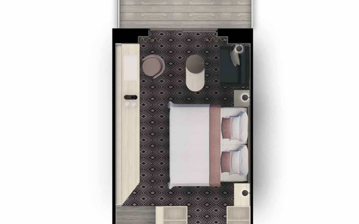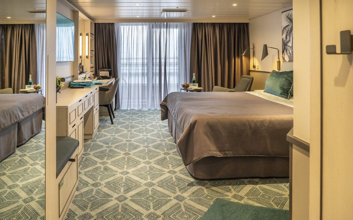 Diese 2-Bett-Junior Suiten mit Privat-Balkon liegen außen auf dem Lido-Deck und verfügen über 2 zusammenstehende Betten, die auf Wunsch getrennt aufgestellt werden können.