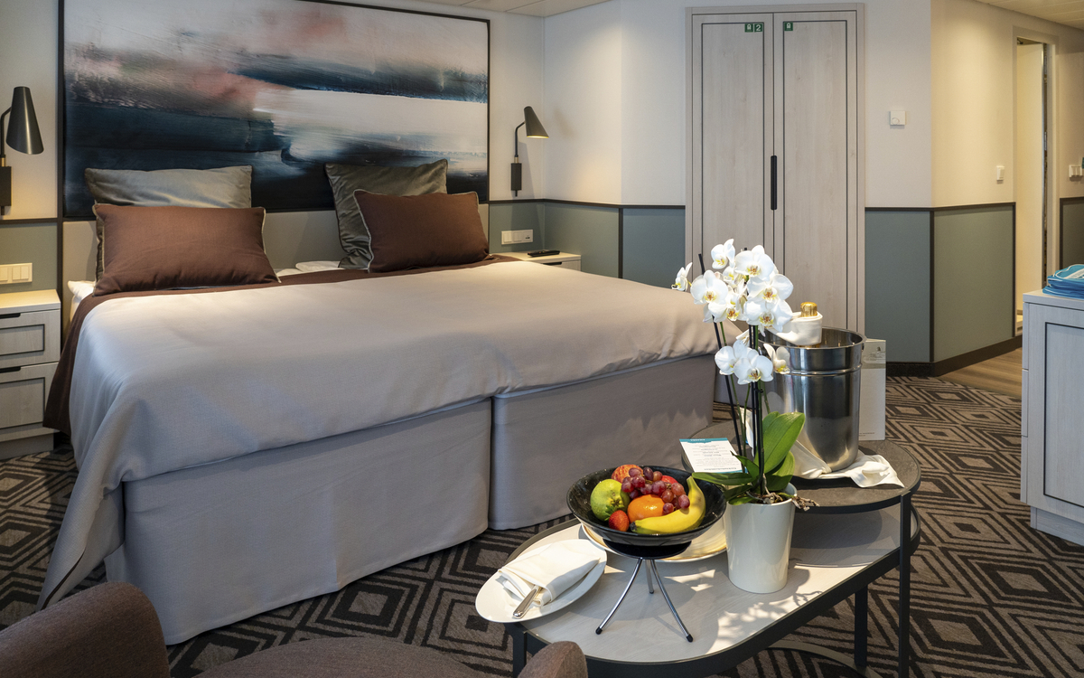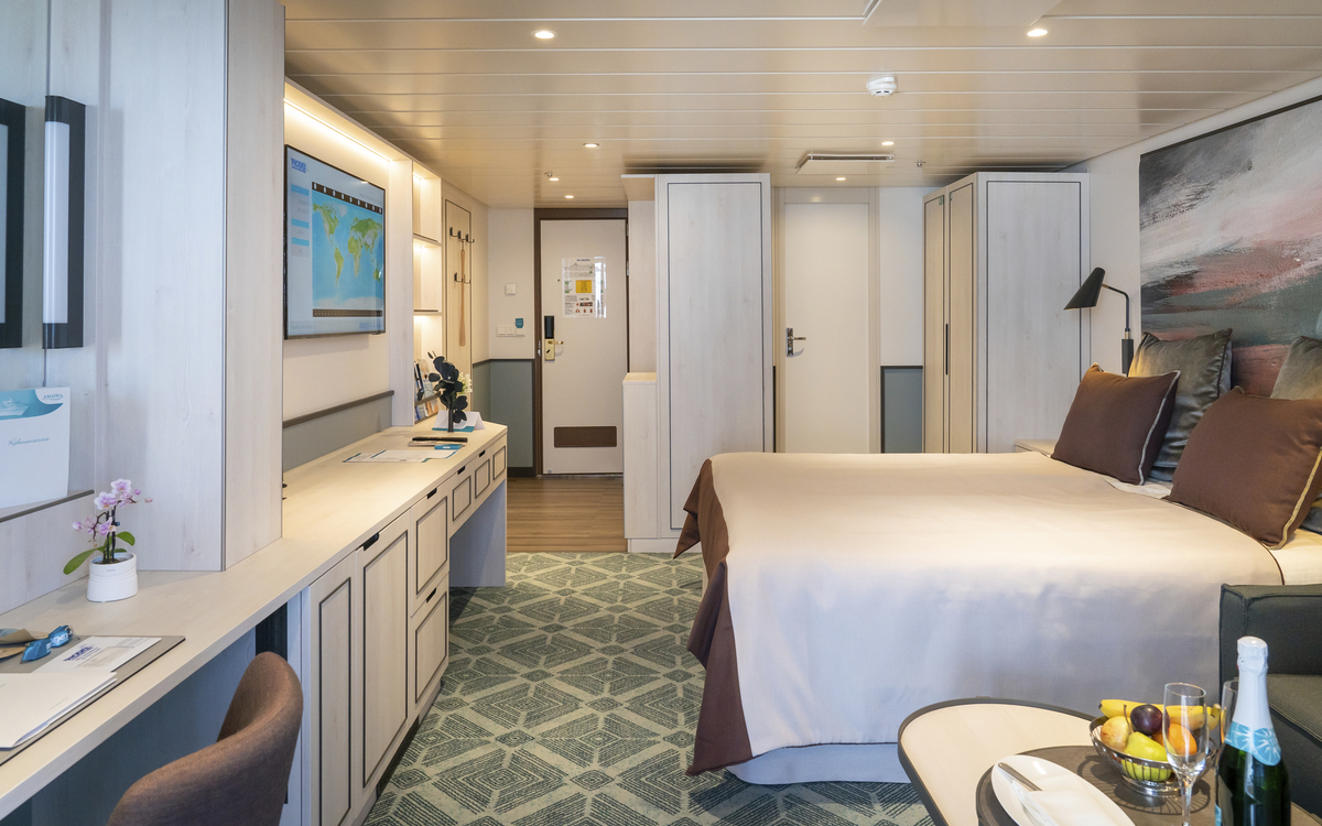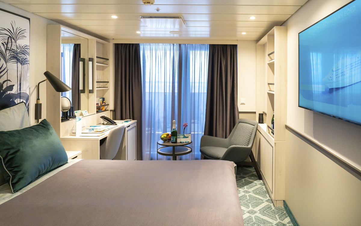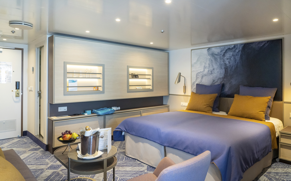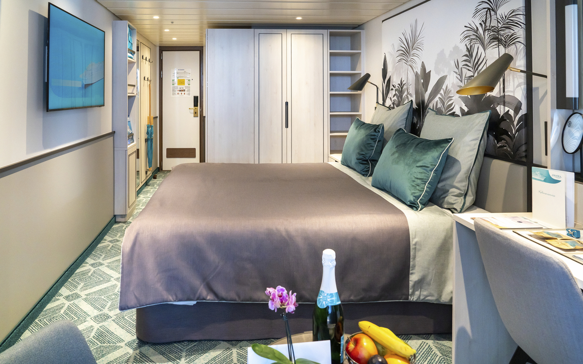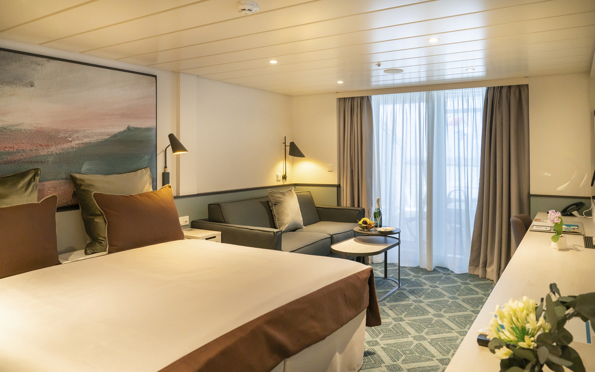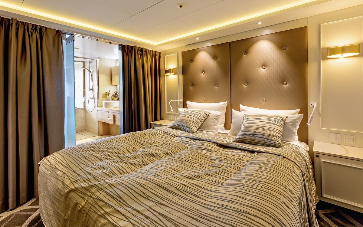 Es gibt 2 Betten, die je nach Wunsch getrennt aufgestellt werden können, separates Schlafsofa mit Tisch und Sessel, 2 Doppelschränke, Spiegelkommode mit mehreren Schubfächern, DU/WC, Duschgel/Schampoo, Bademantel, Fön, SAT-TV (Empfang abhängig vom Fahrgebiet), individuell regulierbare Klimaanlage, Telefon, Safe, Kaffee-Maschine (inklusive Kapseln), Minibar mit Getränkeauswahl (kostenlos), 3 GB Internetzugang p. P. frei (Erneuerung alle 14 Tage; Empfang abhängig vom Fahrgebiet).