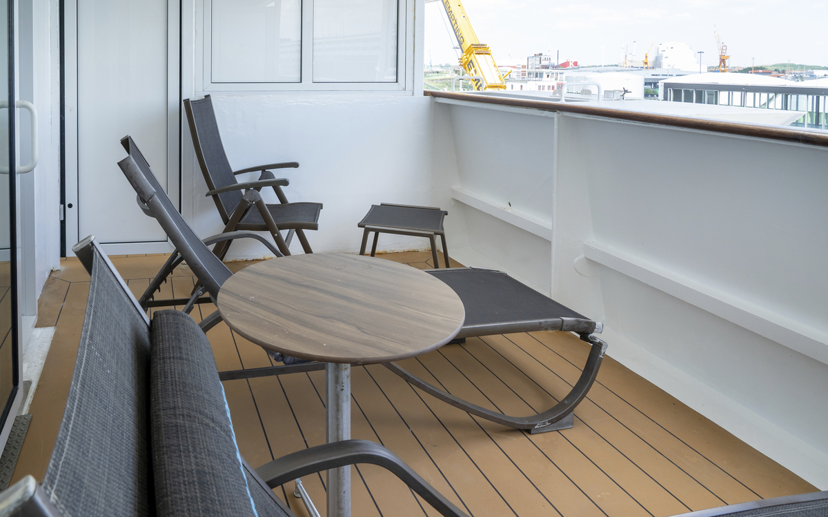 Privat-Balkon mit Tisch, Stühlen und Liege. Kabinengröße ca. 69 qm inkl. Balkon.