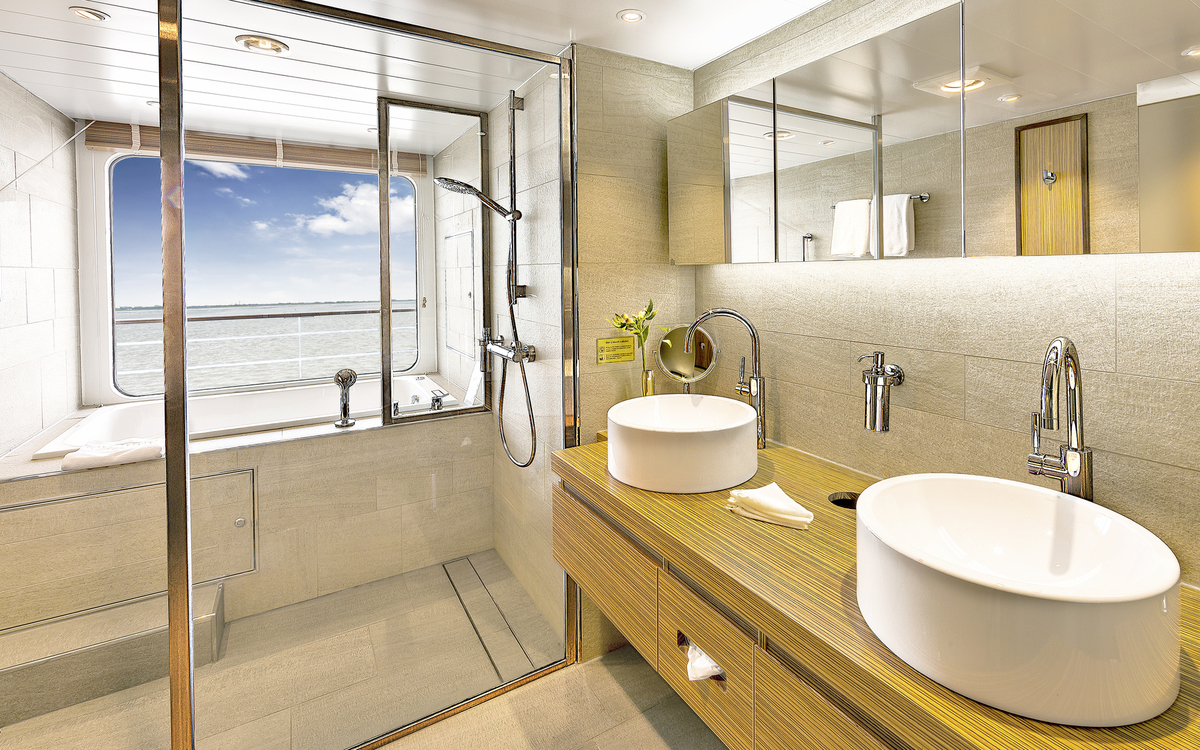 Jede Kabine verfügt über zwei Doppelschränke. Eine Spiegelkommode mit mehreren Schubfächern bietet zusätzliche Ablagemöglichkeiten. Zur Ausstattung gehören SAT-TV (Empfang abhängig vom Fahrgebiet), WLAN (nicht inkl., Empfang abhängig vom Fahrgebiet, individuell regulierbare Klimaanlage, Telefon, Kühlschrank/Minibar, Safe und Föhn. Alle Bäder sind mit Dusche und Handbrause/WC (Kat. V Badewanne, DUWC), Waschbecken, Spiegelschrank und Schminkspiegel ausgestattet. Die Juniorsuiten verfügen zusätzlich über eine Sitzecke, die Suiten über ein größeres Bad sowie einen Sitzbereich mit Sofa, Tisch und Sessel und zum Teil begehbarem Kleiderschrank.