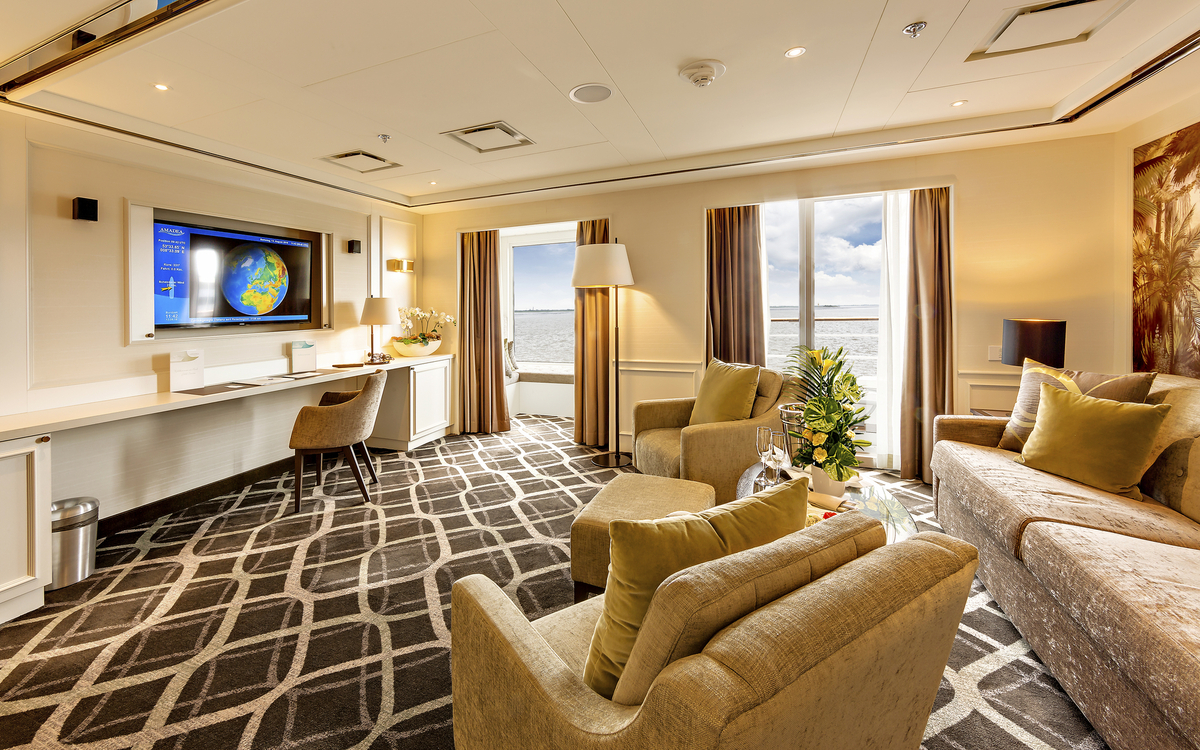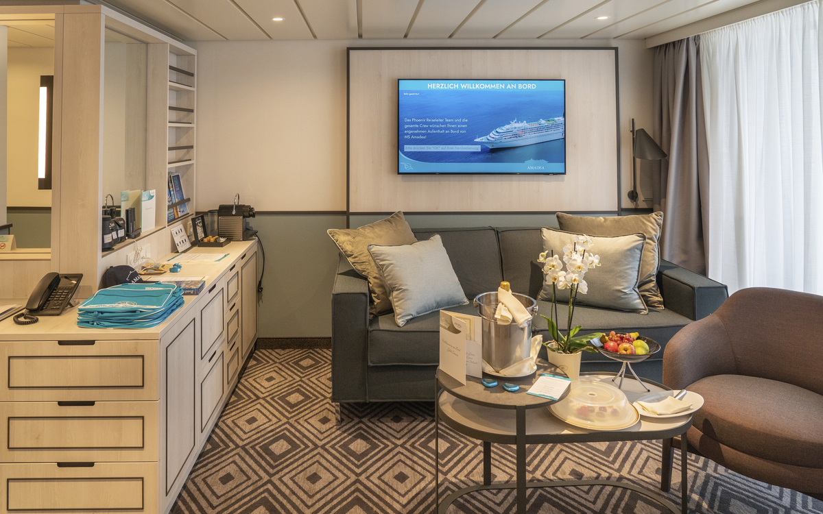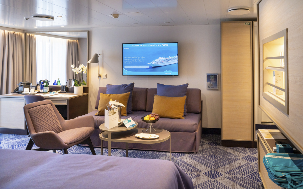 Im Wohnraum großes Sofa (ausziehbar zu einem zusätzlichen Bett) mit Tisch und 2 Sesseln, ein weiterer Tisch mit 2 Stühlen, Anrichte mit mehreren Schränken, SAT-TV (Empfang abhängig vom Fahrgebiet), individuell regulierbare Klimaanlage, Telefon, Safe, Kaffee-Maschine (inklusive Kapseln), Minibar mit Getränkeauswahl (kostenlos), 3 GB Internetzugang frei (Erneuerung alle 14 Tage; Empfang abhängig vom Fahrgebiet).