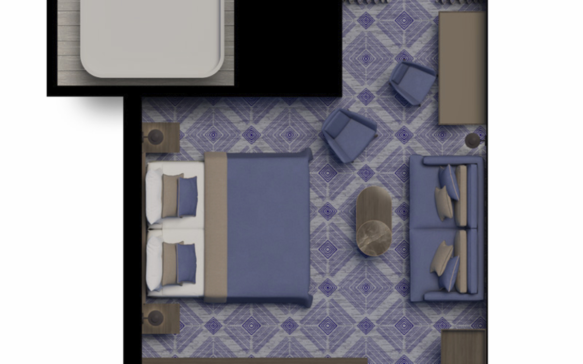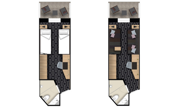 Diese 2-Bett-Suiten mit Privat-Balkon liegen außen auf dem Jupiter-Deck mit Sichtbehinderung und verfügen über 2 Betten, die je nach Wunsch getrennt aufgestellt werden können.