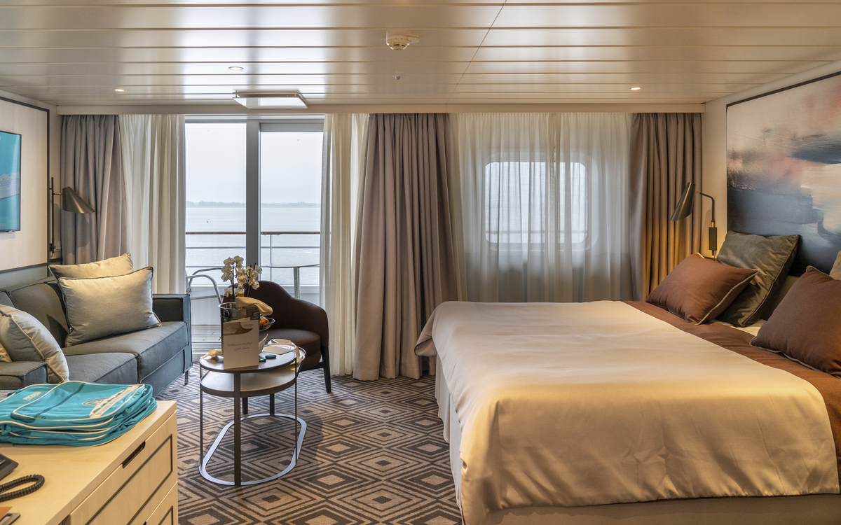 Diese 2-Bett-Junior Suiten Kabine 129 und 130 mit Privat-Balkon liegen außen auf dem Panorama-Deck und verfügen über 2 Betten, die je nach Wunsch getrennt aufgestellt werden können. Beide Kabinen sind behindertenfreundlich ausgestattet.