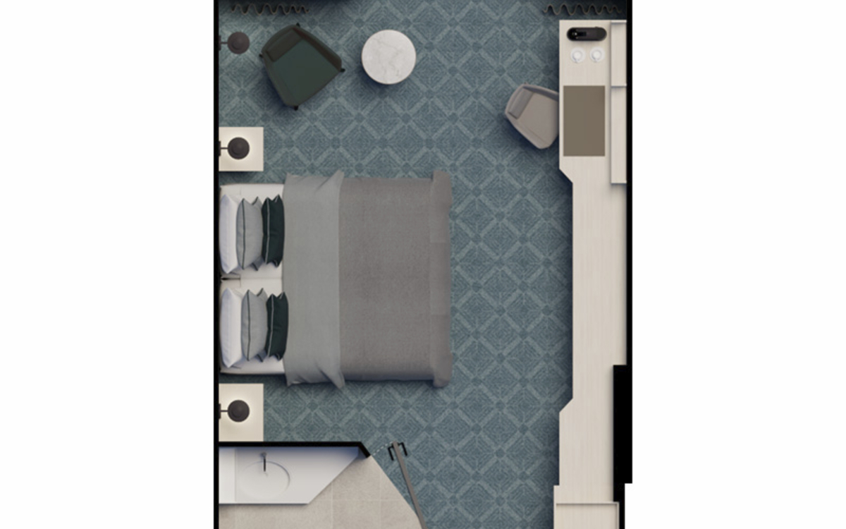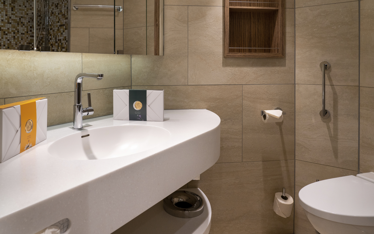 Es gibt 2 Doppelschränke, Spiegelkommode mit mehreren Schubfächern, Couchtisch mit Stuhl, Dusche/WC, Duschgel/Schampoo, Bademantel, Fön, SAT-TV (Empfang abhängig vom Fahrgebiet), individuell regulierbare Klimaanlage, Telefon, Safe, Minibar, Kaffeemaschine (inklusive Kapseln), WLAN (nicht inkl., Empfang abhängig vom Fahrgebiet).