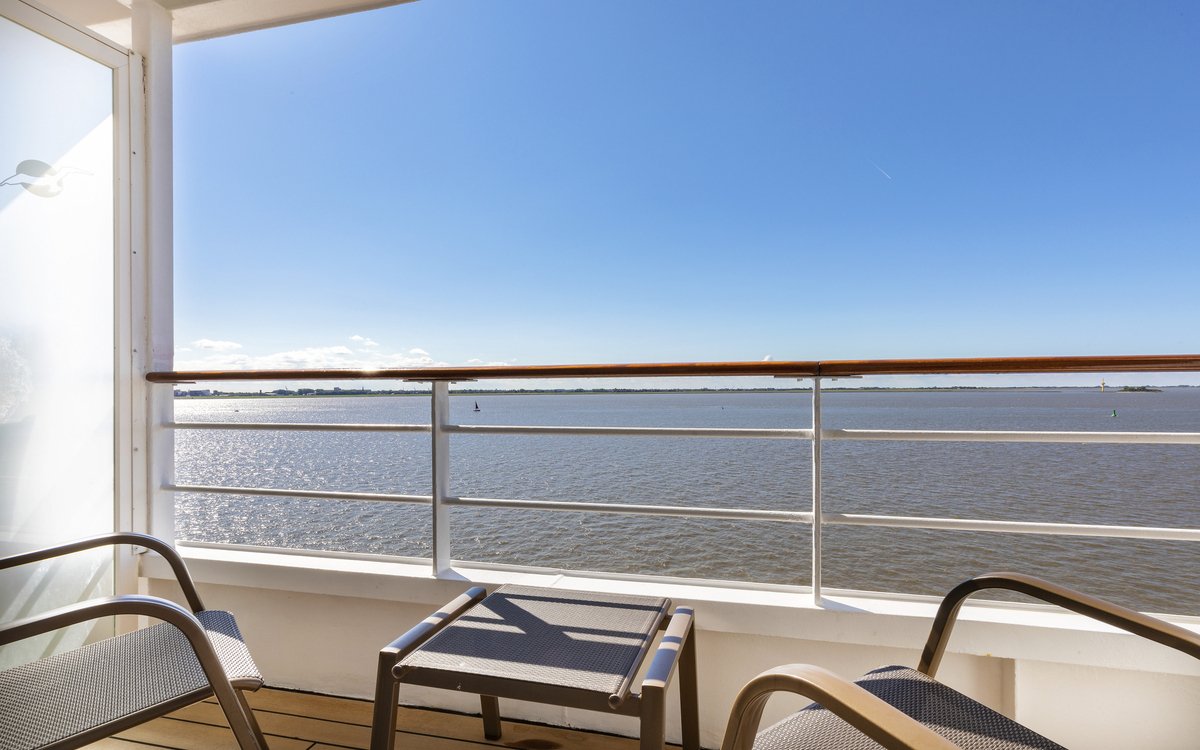 Diese 2-Bett-Kabinen zur Alleinbenutzung mit Privat-Balkon liegen außen auf dem Lido-Deck mit leichter Sichtbehinderung und verfügen über 2 untere Betten, 2 Doppelschränke, Spiegelkommode mit mehreren Schubfächern, Couchtisch mit Stuhl, Dusche/WC, Duschgel/Schampoo, Bademantel, Fön, SAT-TV (Empfang abhängig vom Fahrgebiet), individuell regulierbare Klimaanlage, Telefon, Safe, Minibar, WLAN (nicht inkl., Empfang abhängig vom Fahrgebiet).