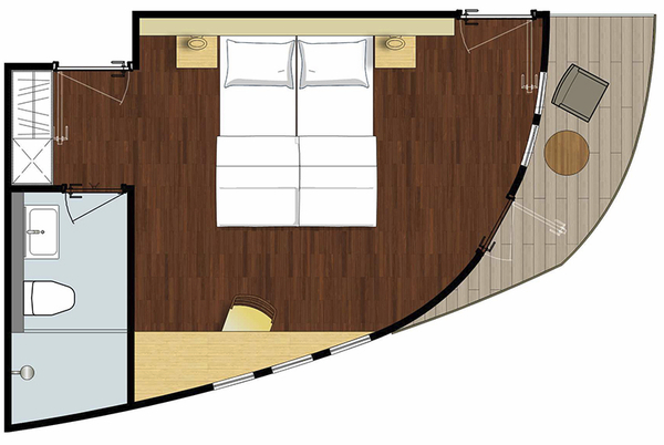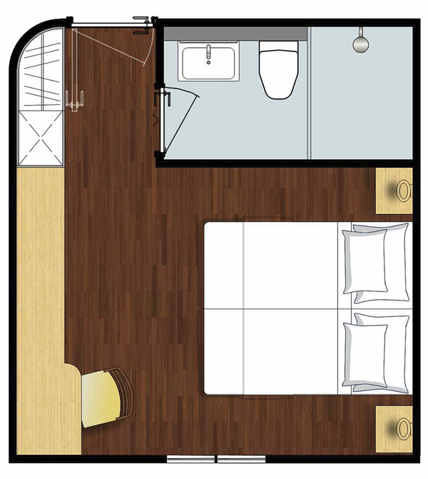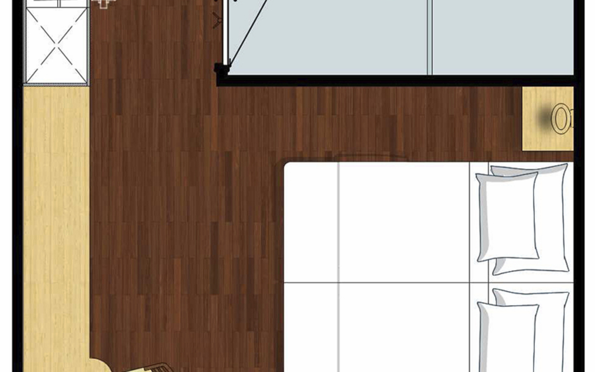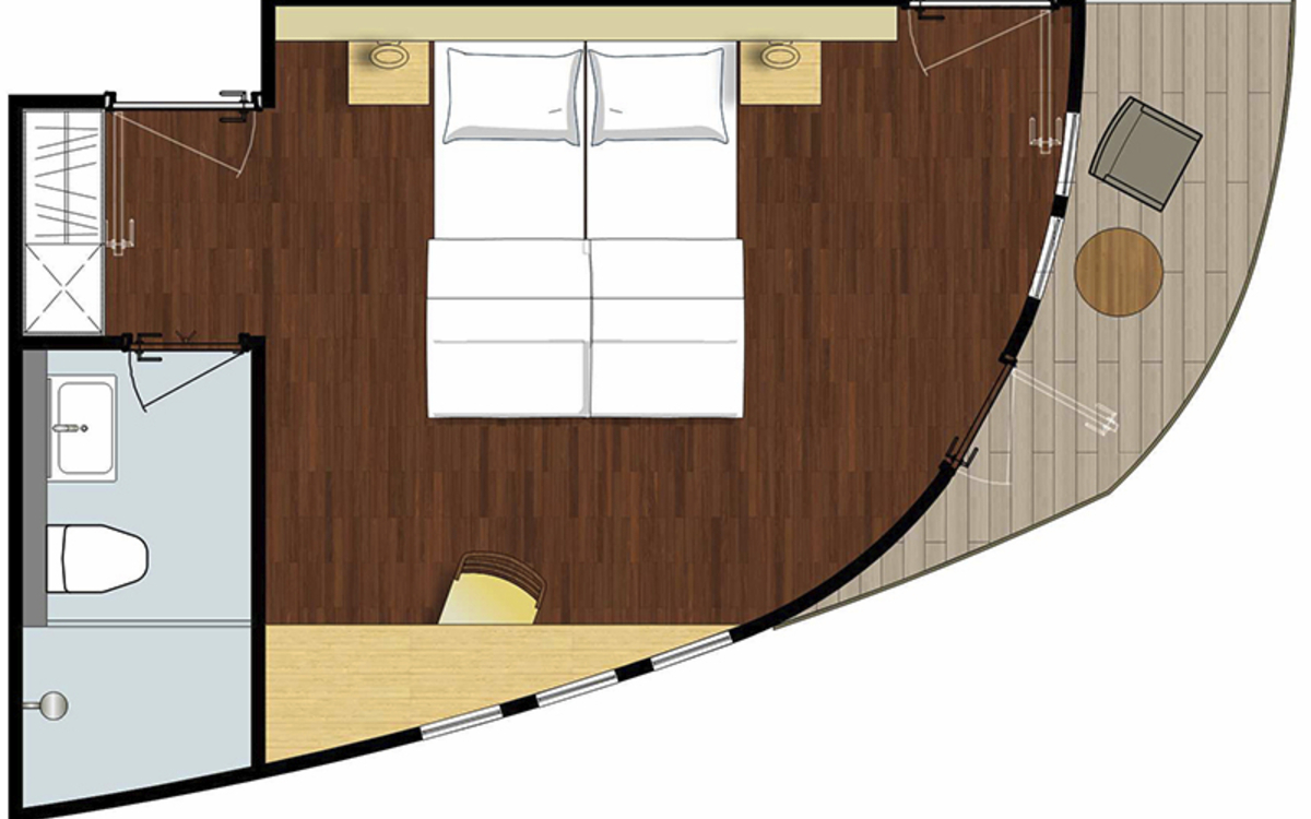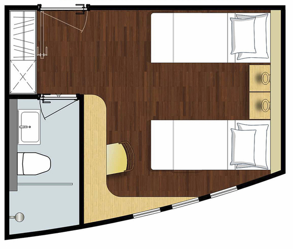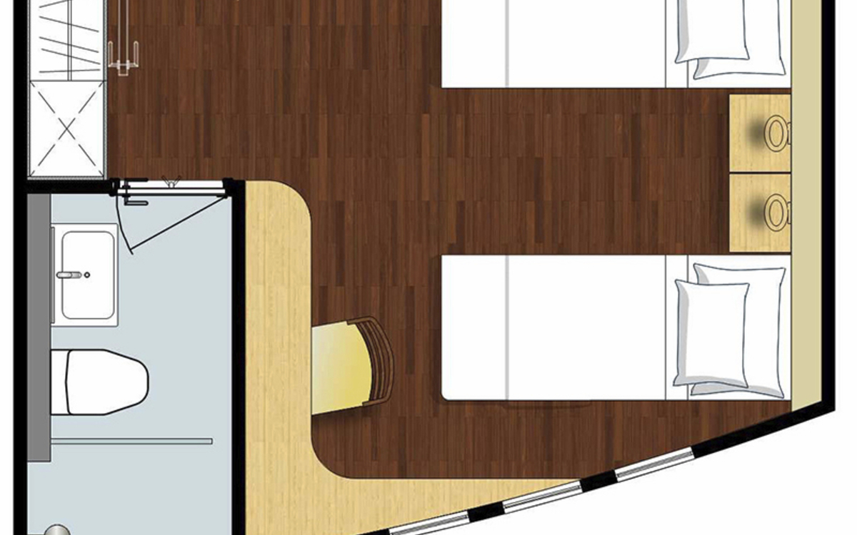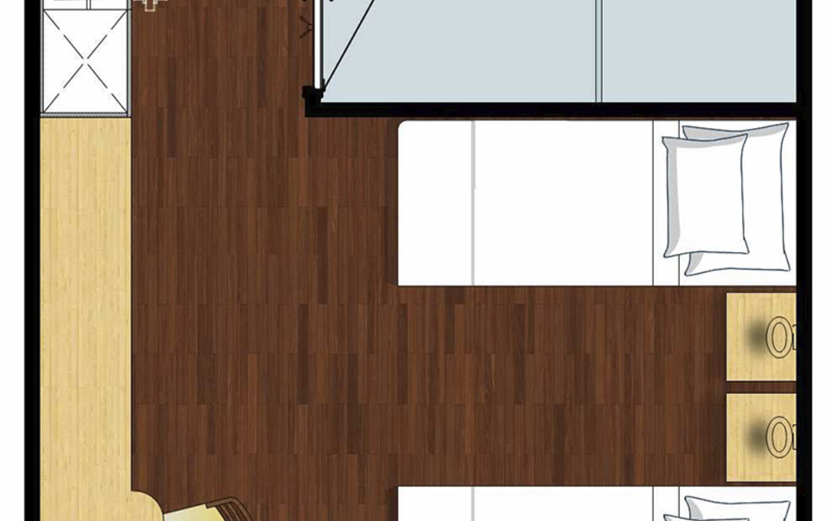 Ausstattung: Dusche/WC, individuell regulierbare Klimaanlage, Safe, Fenster zum Öffnen, Kat. D mit Minibar und Balkon. Bordspannung 110 V Wechselstrom.