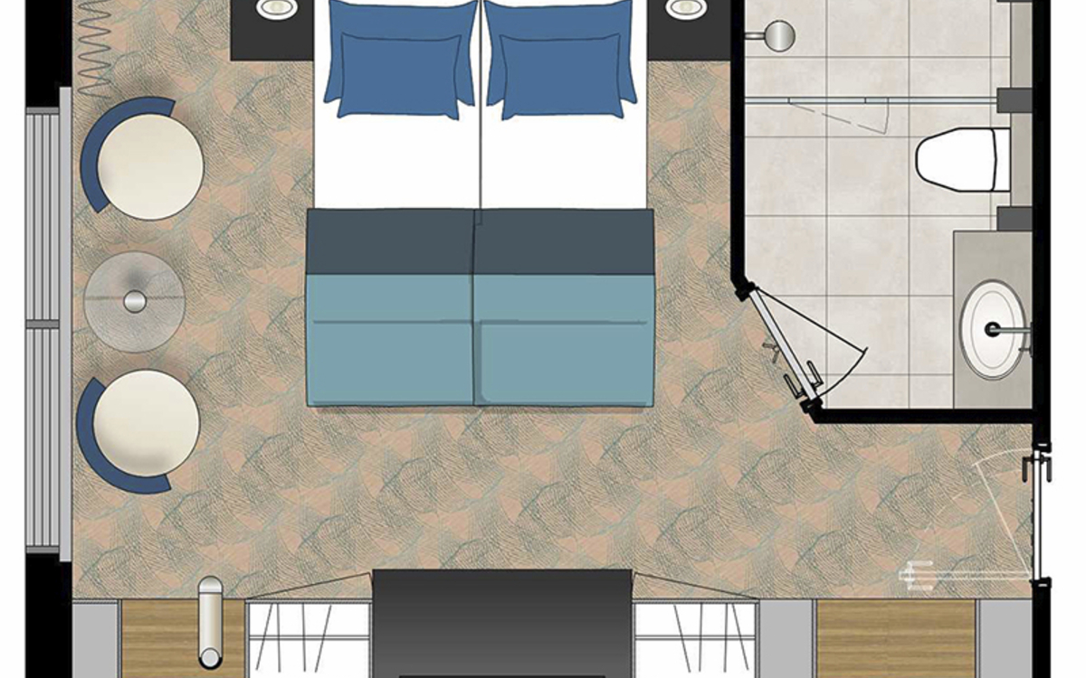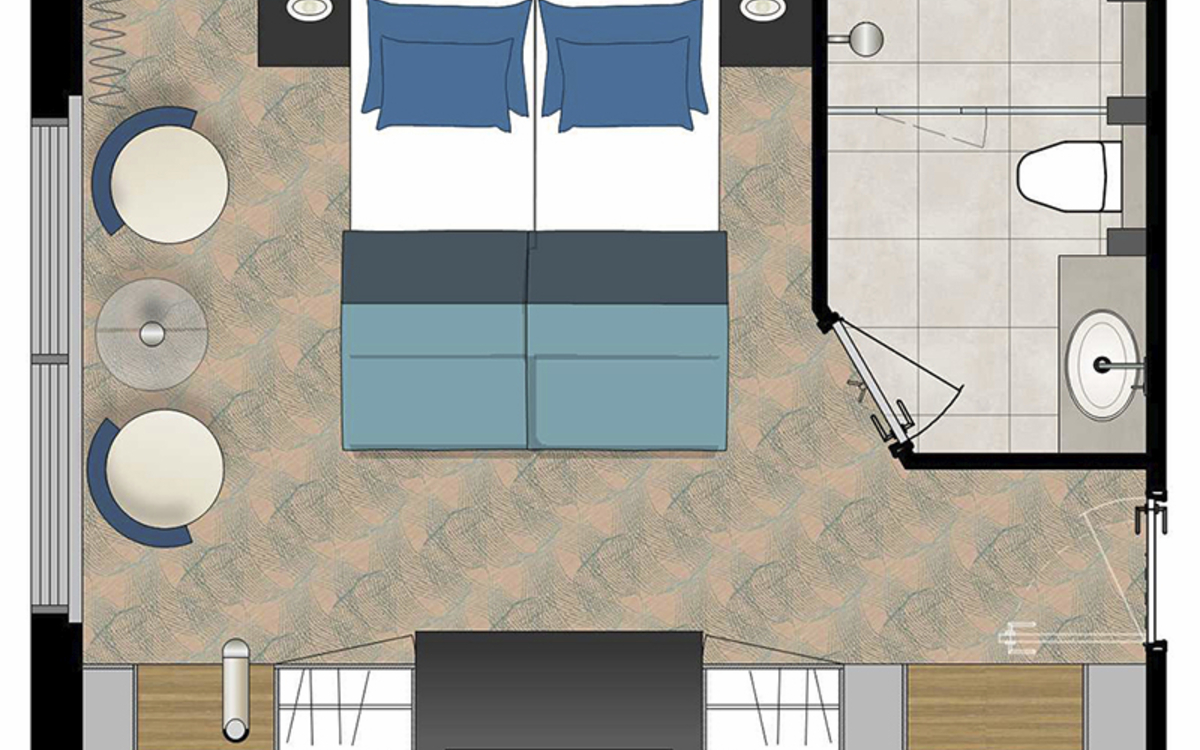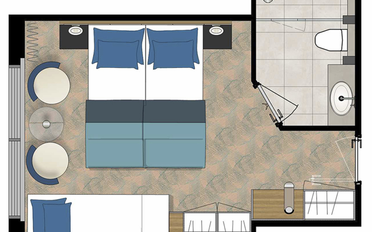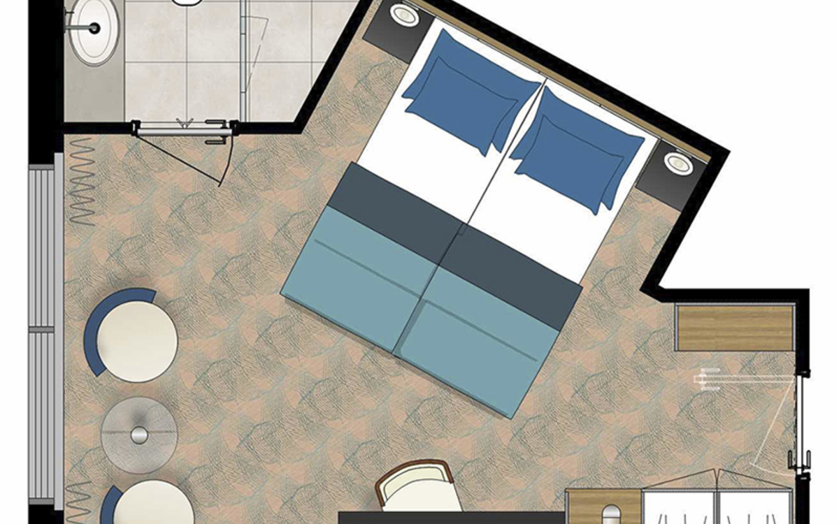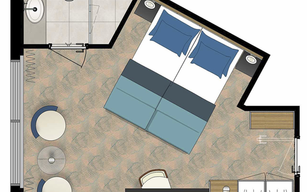 Ausstattung: Dusche/WC, Fön, individuell regulierbare Klimaanlage, SAT-TV (Flachbirldschirm), Radio, Minibar, Kaffeemaschine, Safe, telefon, Bodspannung 230 V Wechselstrom. Kabinengröße ca. 18,5 qm.