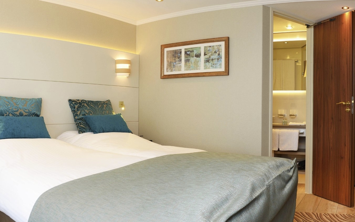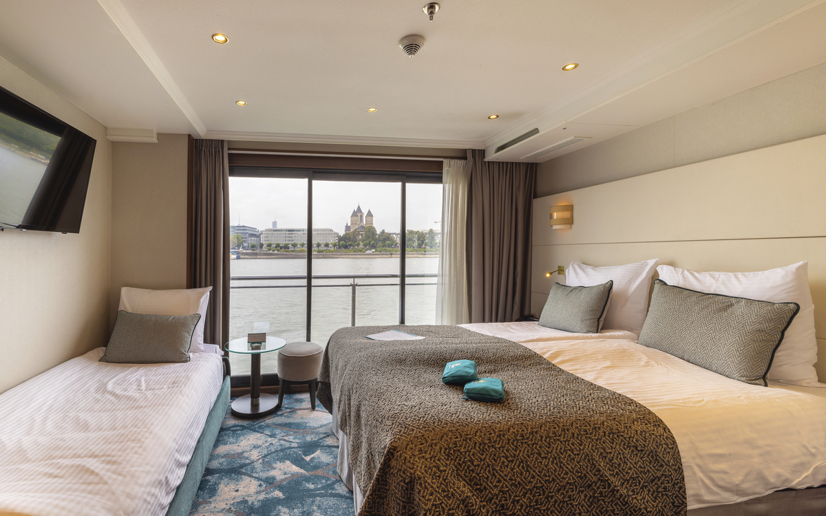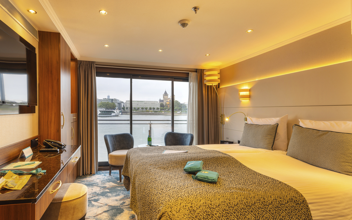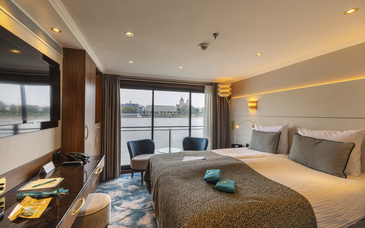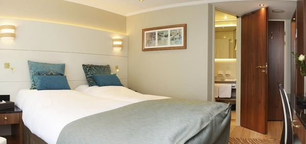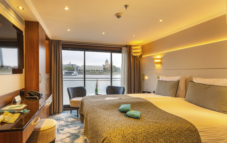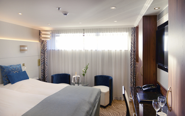 Alle Kabinen liegen außen und sind komfortabel und luxuriös eingerichtet und haben einen französischen Balkon. Die Betten lassen sich wahlweise als Doppel- oder Einzelbetten stellen
