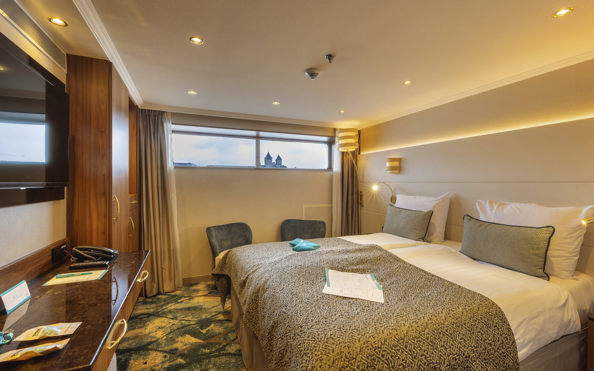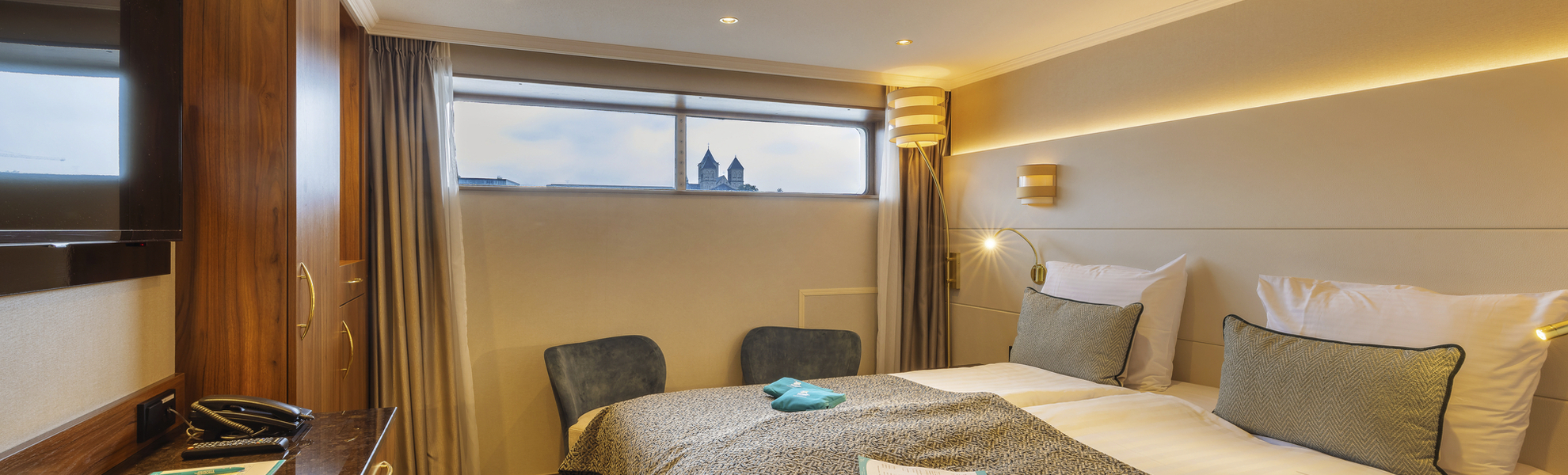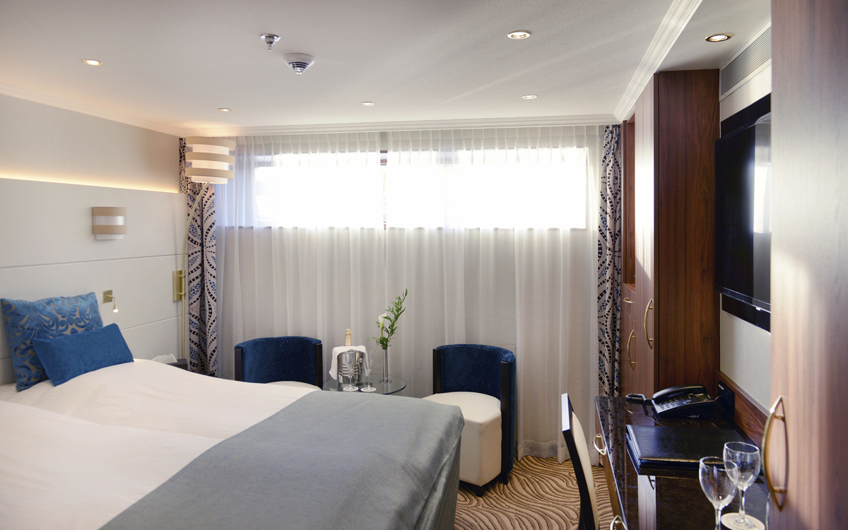 Alle Kabinen liegen außen und sind komfortabel und luxuriös eingerichtet mit kleinen Fenstern, die aus Sicherheitsgründen nicht zu öffnen sind. Die Betten lassen sich wahlweise als Doppel- oder Einzelbetten stellen. Die Kabinen dieser Kategorie liegen im hinteren Bereich des Schiffes, bei fahrendem Schiff verstärkte Maschinengeräusche.