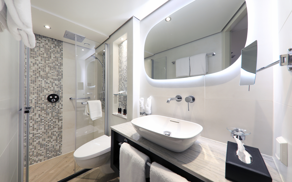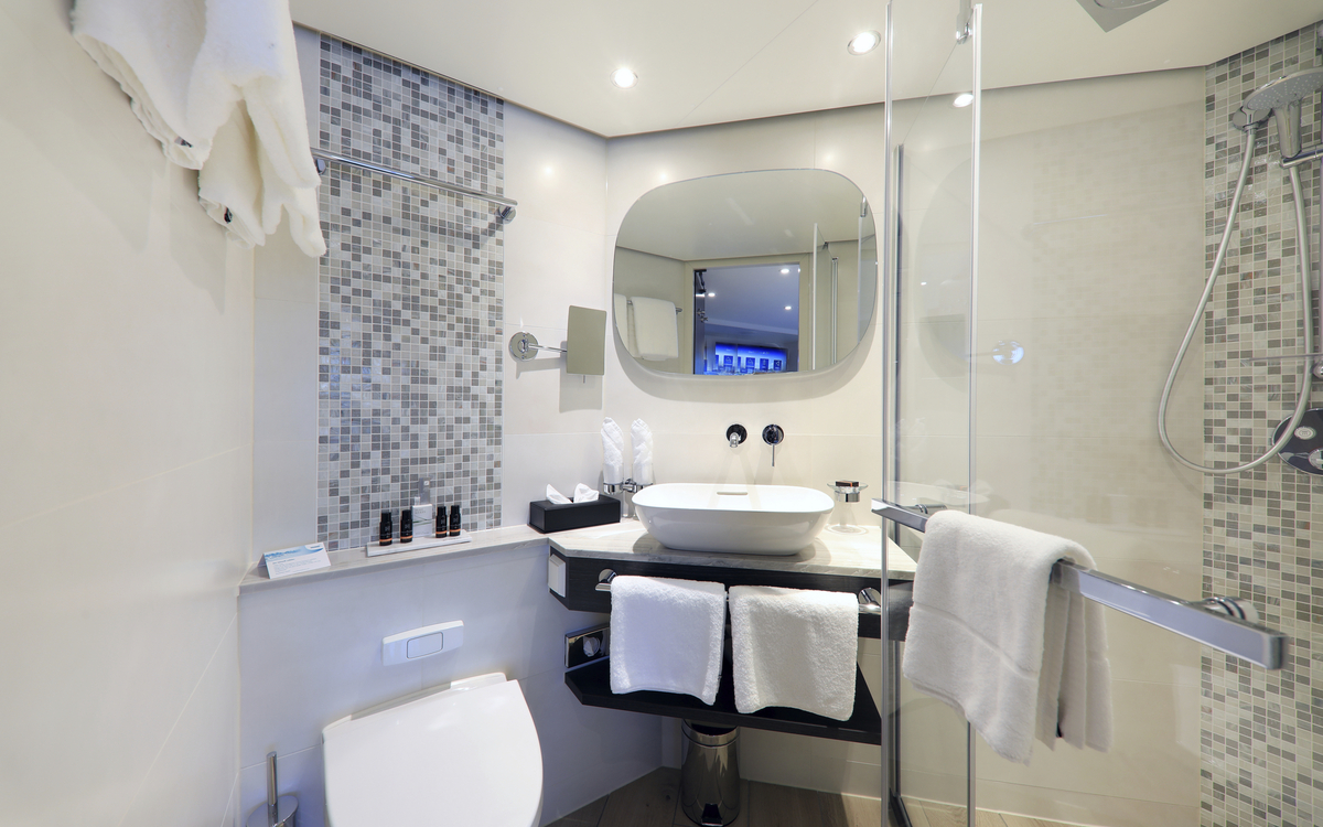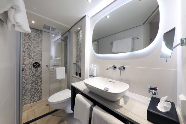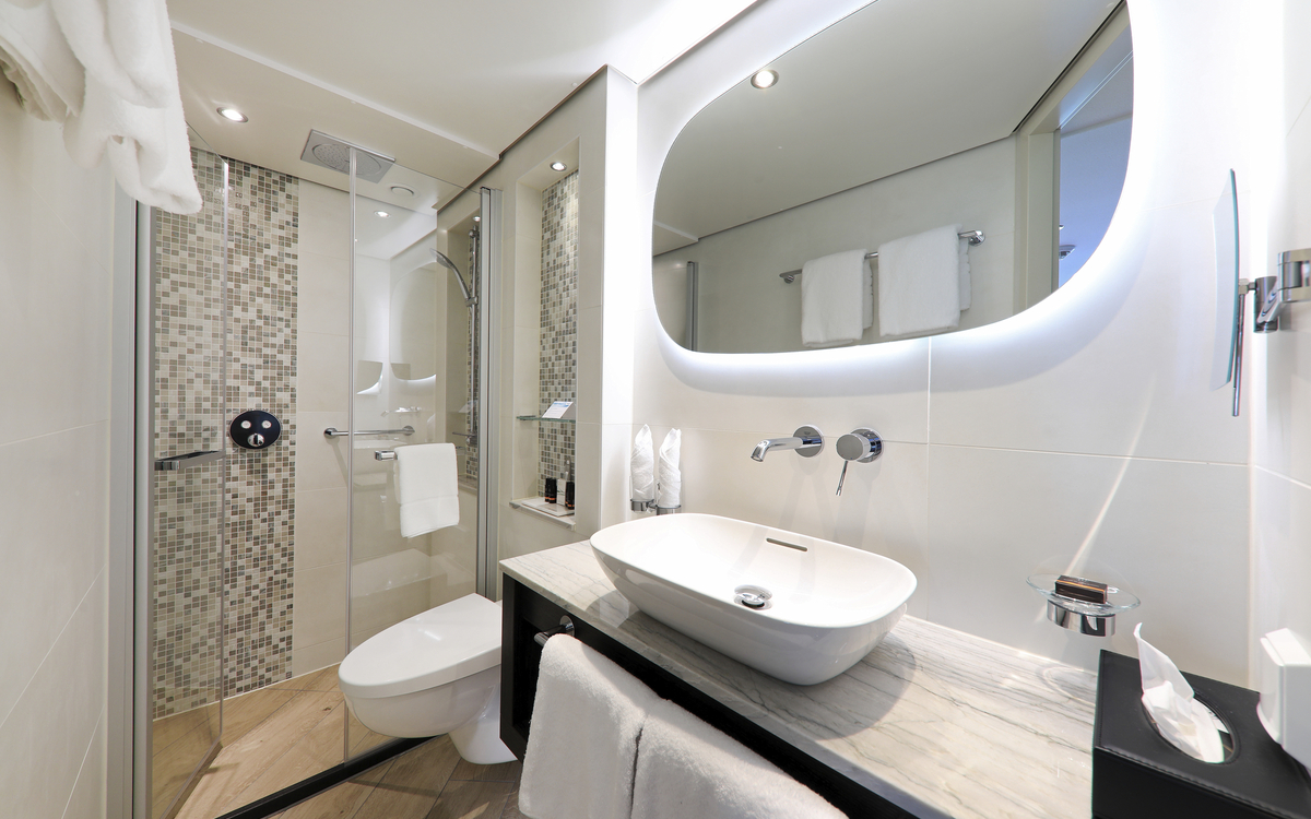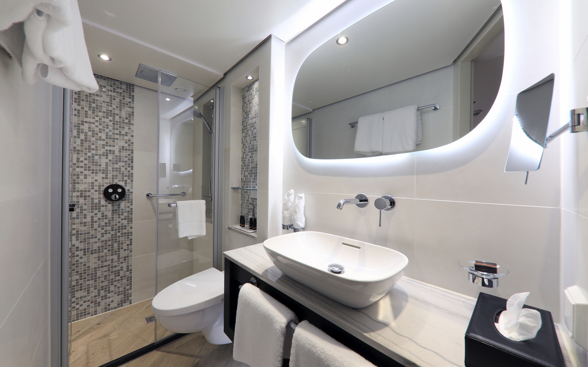 Dusche/WC/Fön, Klimaanlage, TV/Bordradio, Minibar, Kaffeemaschine, Safe, Telefon, Bordspannung 220V Wechselstrom. Kabinengröße ca. 17 qm.