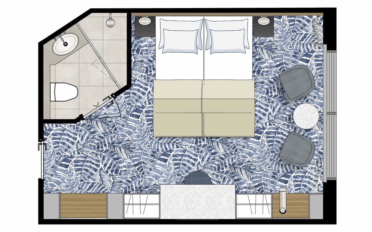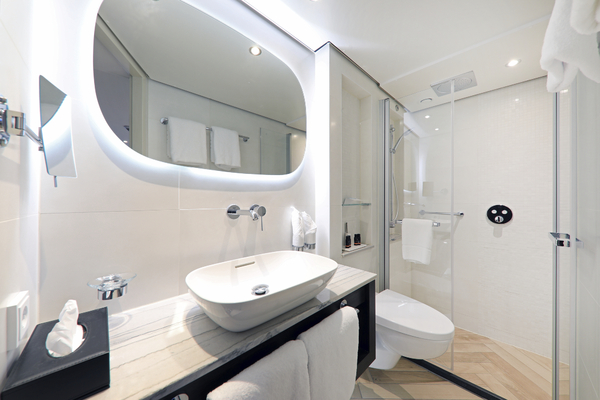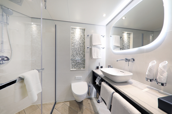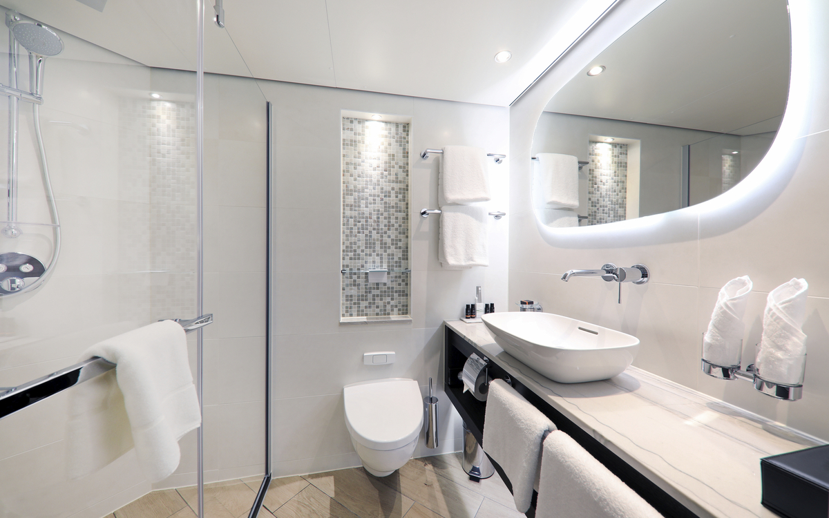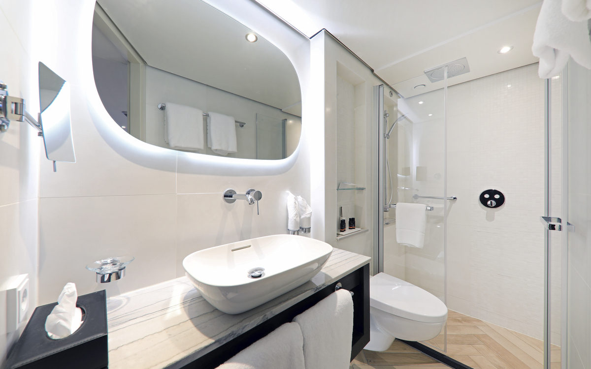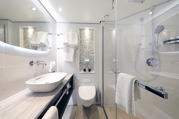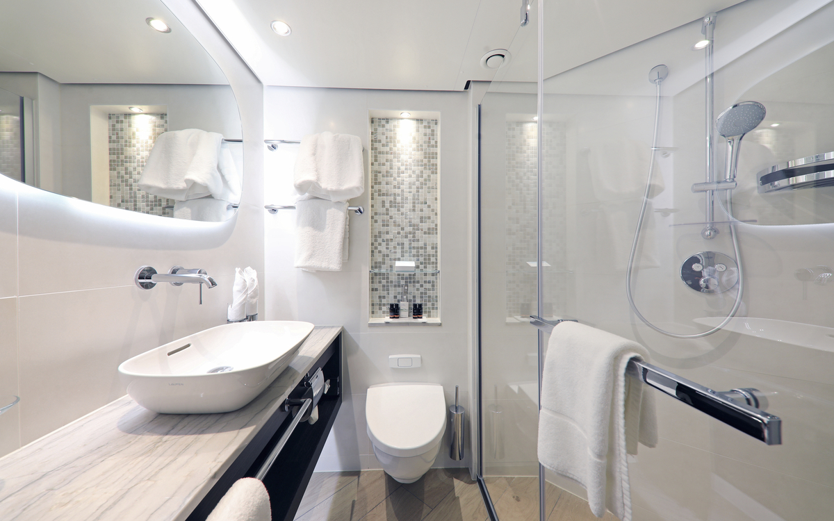 Ausstattung: Dusche/WC/Fön, Klimaanlage, TV/Bordradio, Minibar, Kaffeemaschine, Safe, Telefon, Bordspannung 220V Wechselstrom. Kabinengröße ca. 18,5 qm.