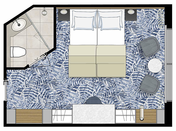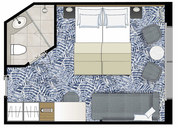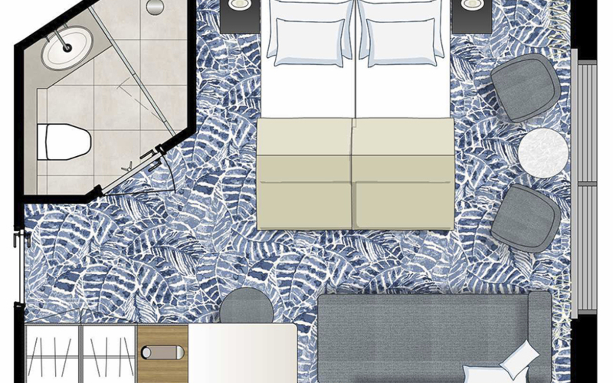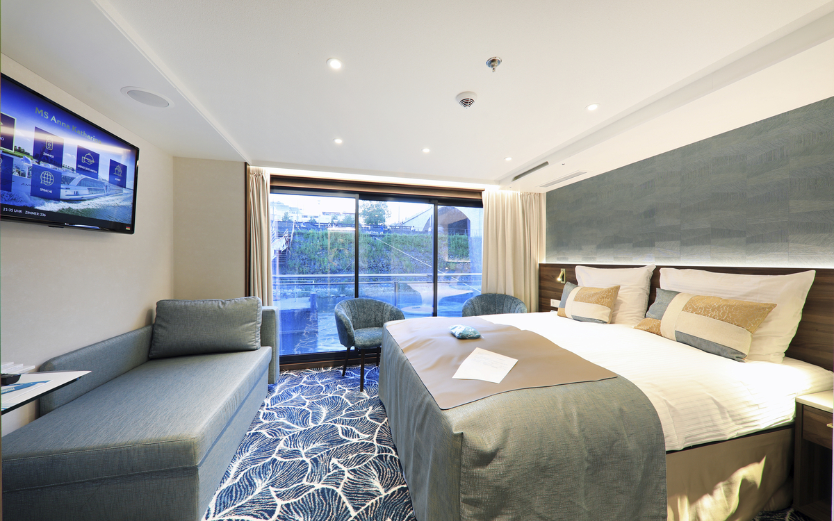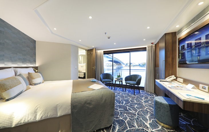 Alle Kabinen liegen außen und sind komfortabel und luxuriös eingerichtet und haben einen französischen Balkon. Die Betten lassen sich wahlweise als Doppel- oder Einzelbetten stellen.
