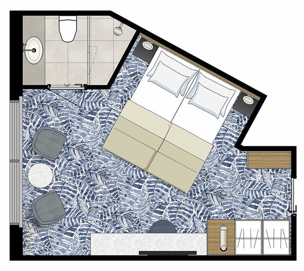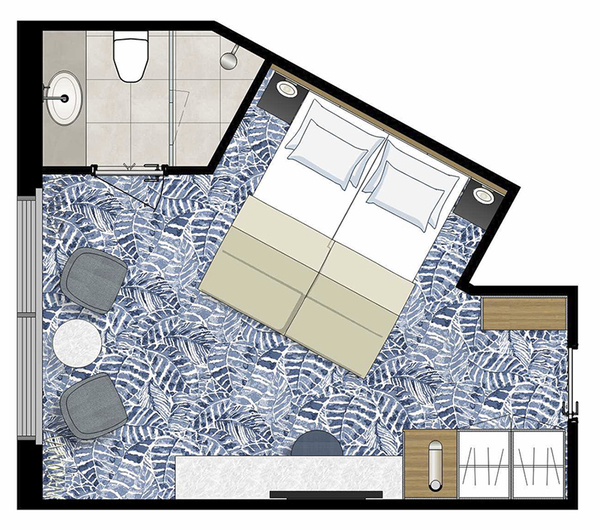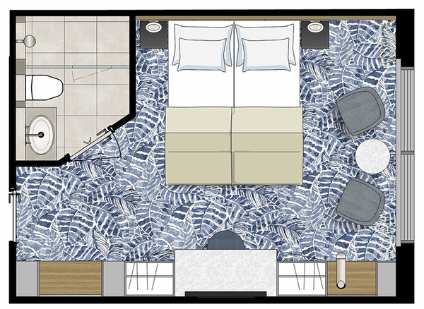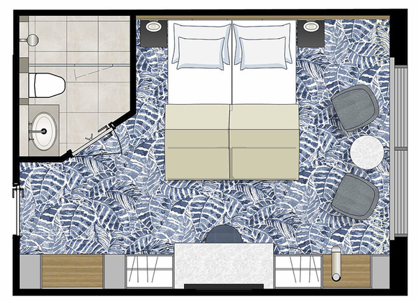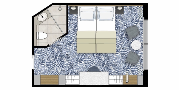 Ausstattung: Dusche/WC, Föhn, individuell regulierbare Klimaanlage, SAT-TV, Radio, Minibar, Kaffeemaschine, Safe, Telefon, kleine Tageszeitung. Die Bordspannung liegt bei 230 V Wechselstrom. Die Betten lassen sich wahlweise als Doppel- oder Einzelbetten stellen.