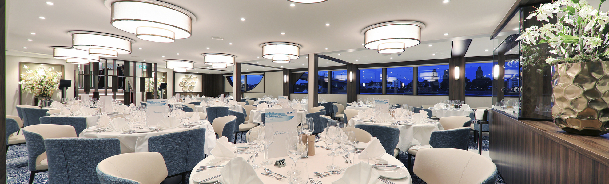 MS Anna Katharina verfügt entsprechend ihrer Kategorie über ein komfortables und zugleich gemütliches Restaurant. Große Fensterfronten für tolle Ausblicke auch während der Mahlzeiten Ein aufmerksames Restaurant- und Küchenteam kümmert sich à la carte oder in Buffetform um Ihr kulinarisches Wohlergehen. Neben der freien Tischplatzwahl bei Frühstück und Mittagessen bzw. der festen Tischplatzwahl beim Abendessen bieten wir offene, lange Tischzeiten an.