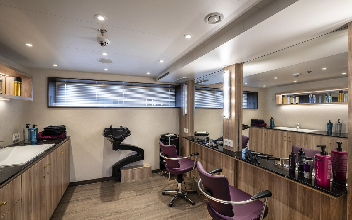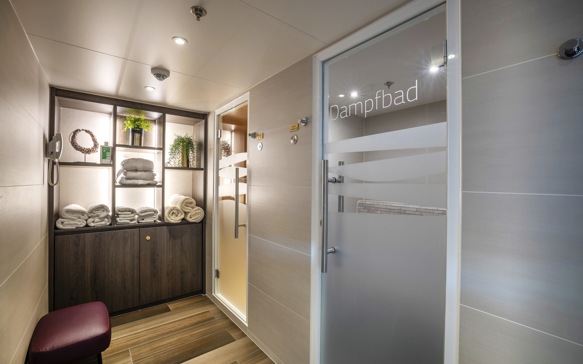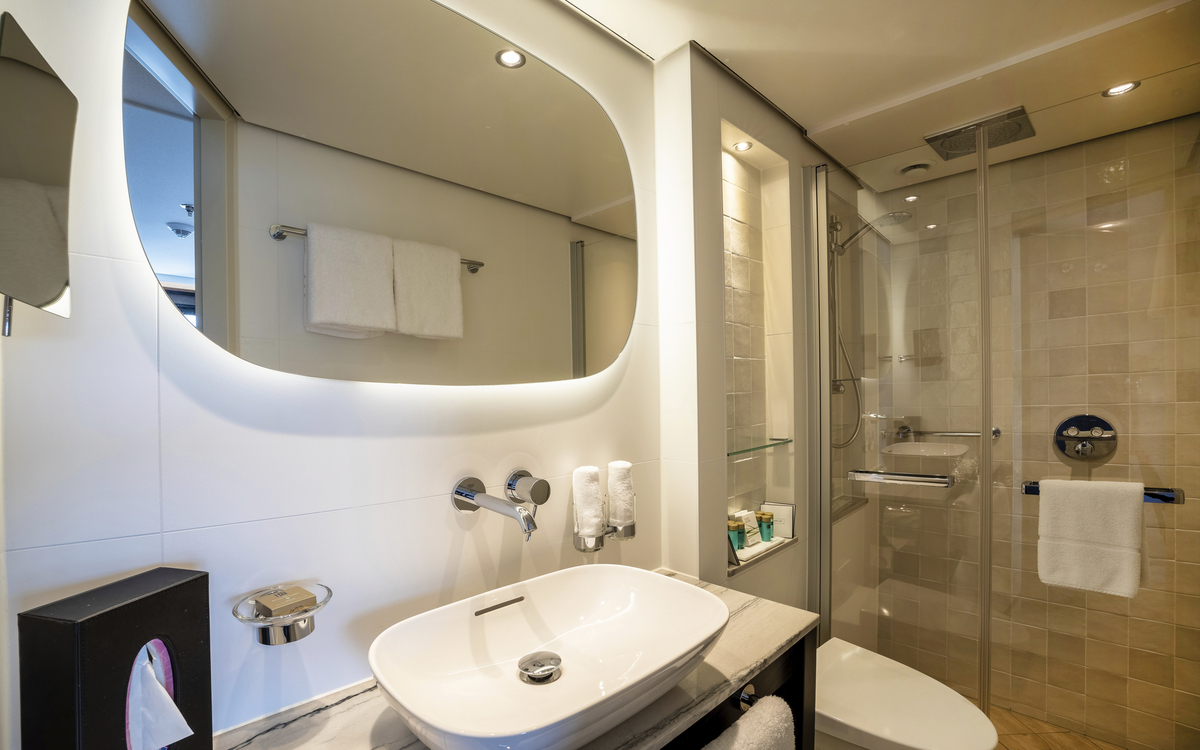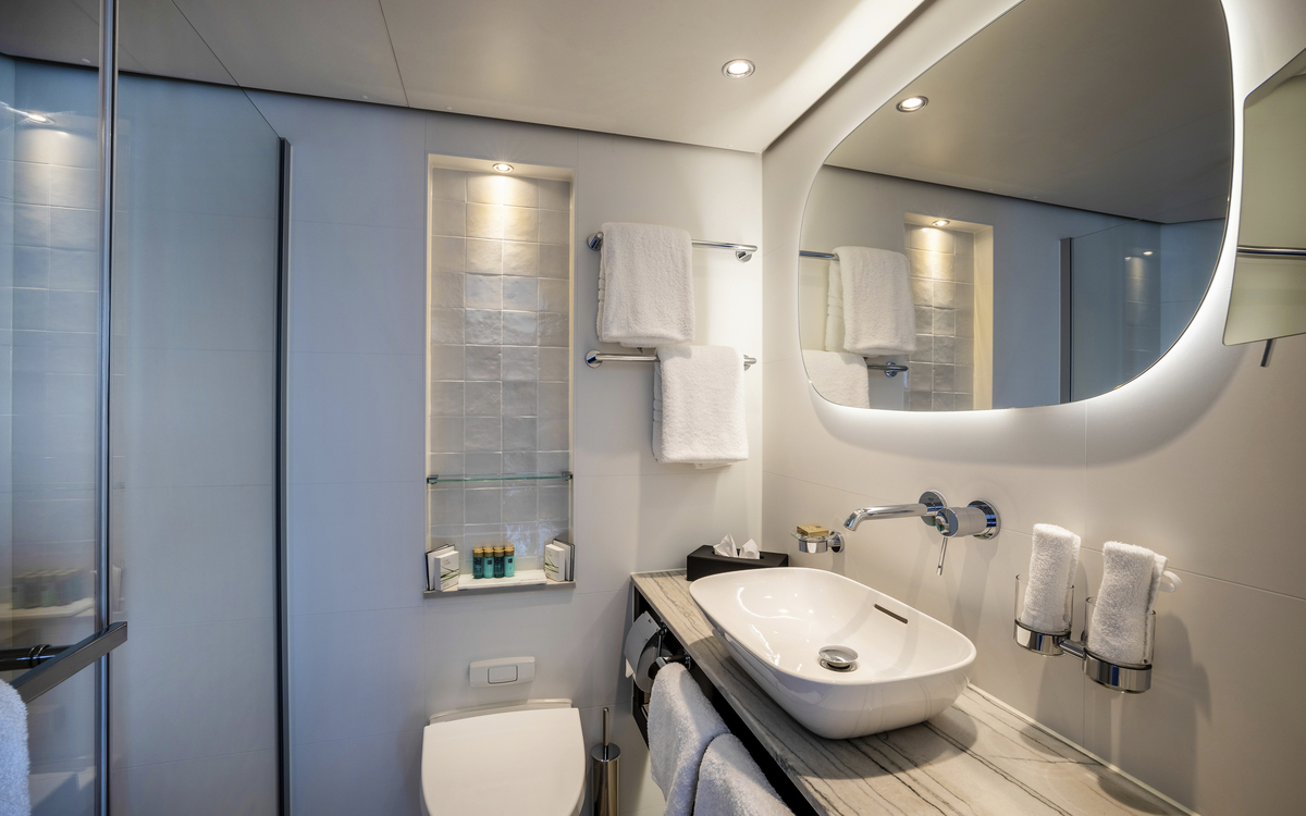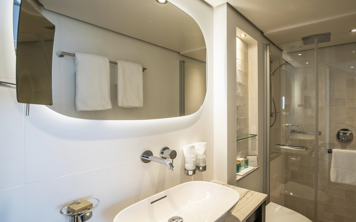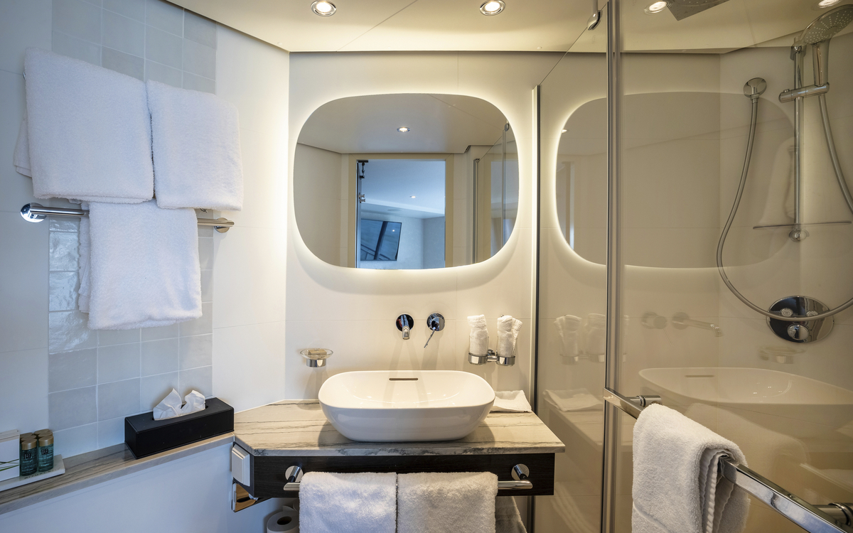 Ausstattung: Dusche/WC, Fön, individuell regulierbare Klimaanlage, SAT-TV (Flachbildschirm), Radio, Minibar, Kaffeemaschine, Safe, Telefon. Die Bordspannung liegt bei 230 V Wechselstrom. Die Betten lassen sich wahlweise als Doppel- oder Einzelbetten stellen. Kabinengröße ca. 17 qm.