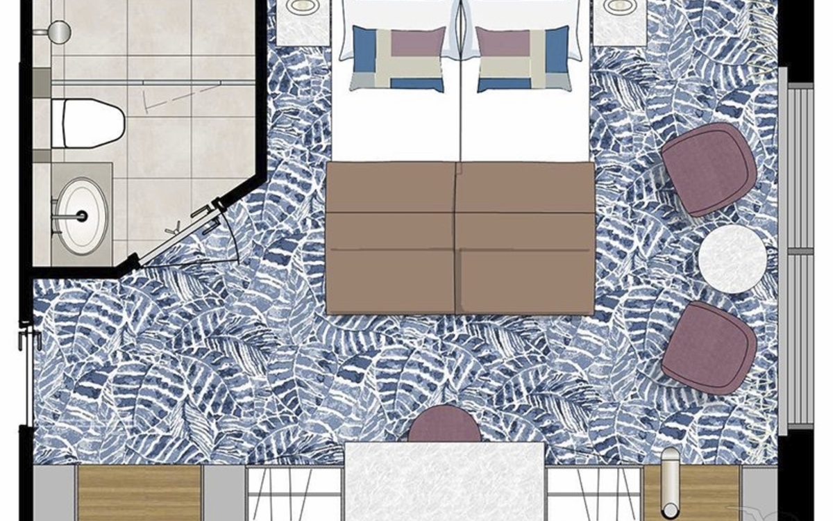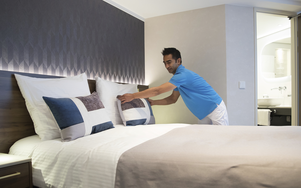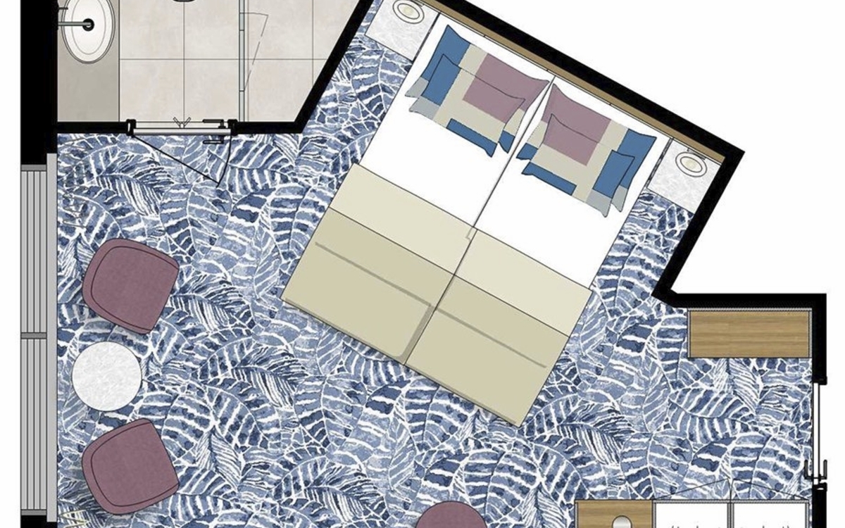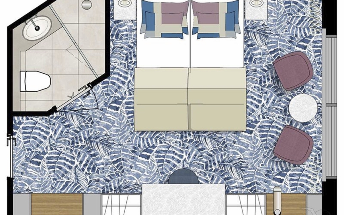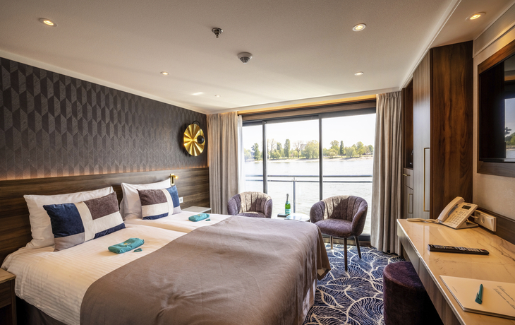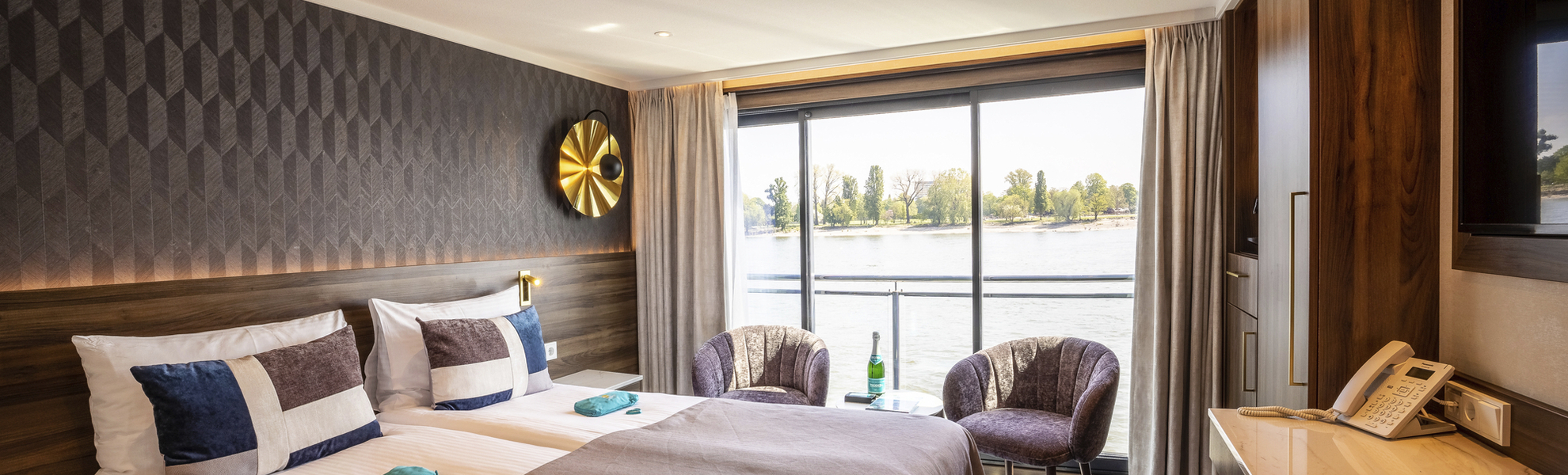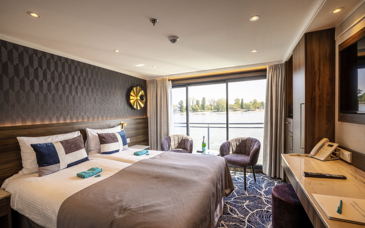 Alle Kabinen liegen außen und sind komfortabel und luxuriös eingerichtet und haben einen französischen Balkon. Die Betten lassen sich wahlweise als Doppel- oder Einzelbetten stellen.