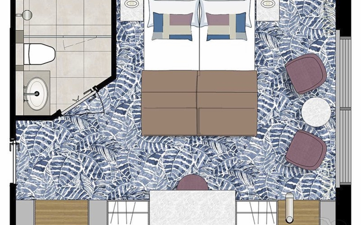 Ausstattung: Dusche/WC, Fön, individuell regulierbare Klimaanlage, SAT-TV (Flachbildschirm), Radio, Minibar, Kaffeemaschine, Safe, Telefon. Die Bordspannung liegt bei 230 V Wechselstrom. Die Betten lassen sich wahlweise als Doppel- oder Einzelbetten stellen. Kabinengröße ca. 18,5 qm.