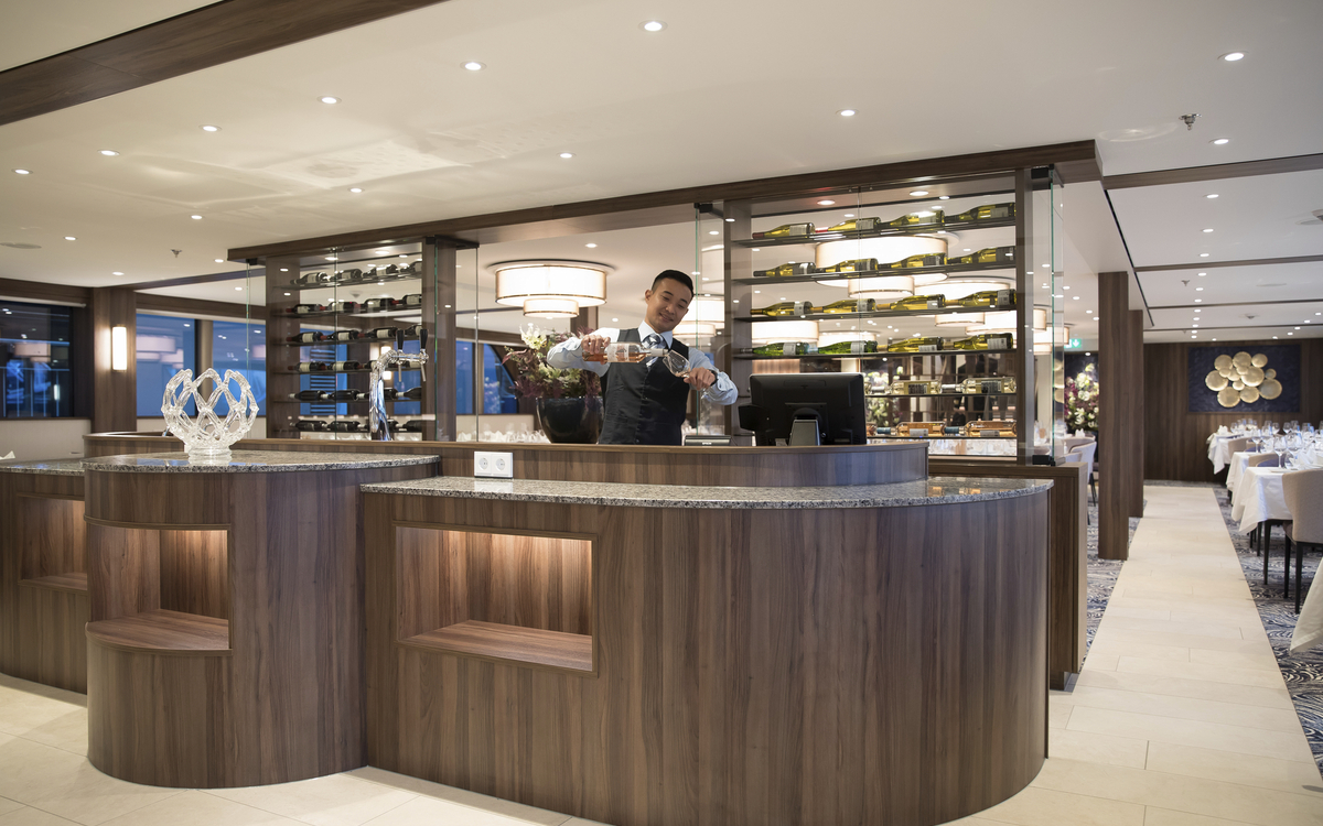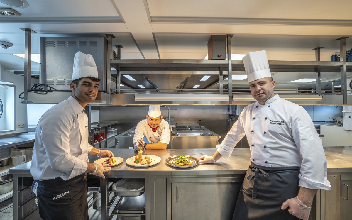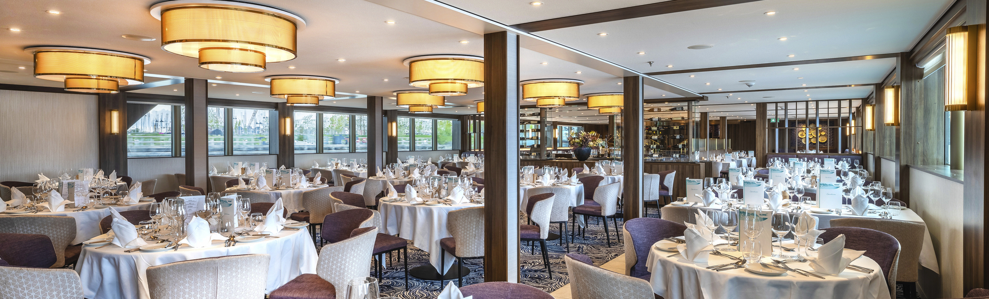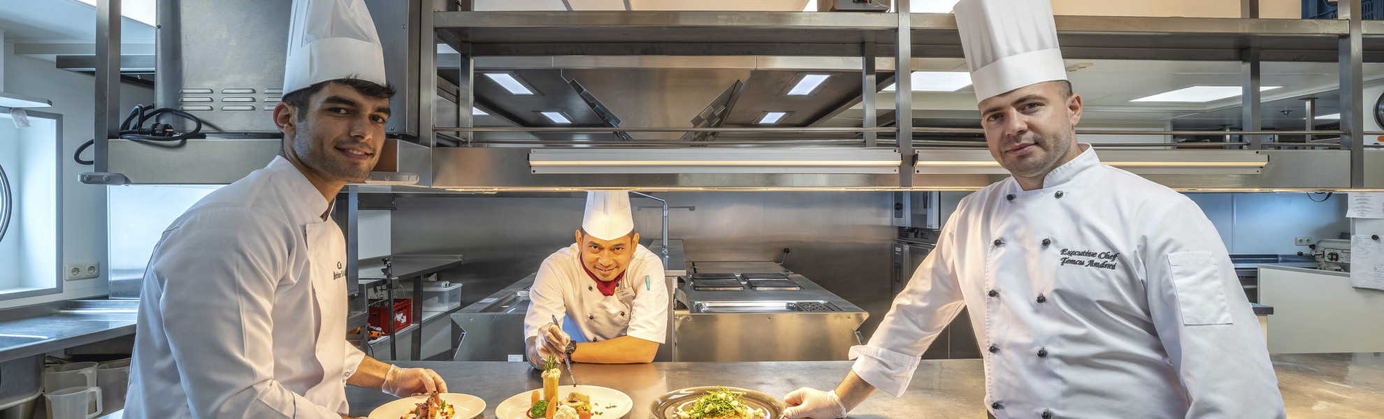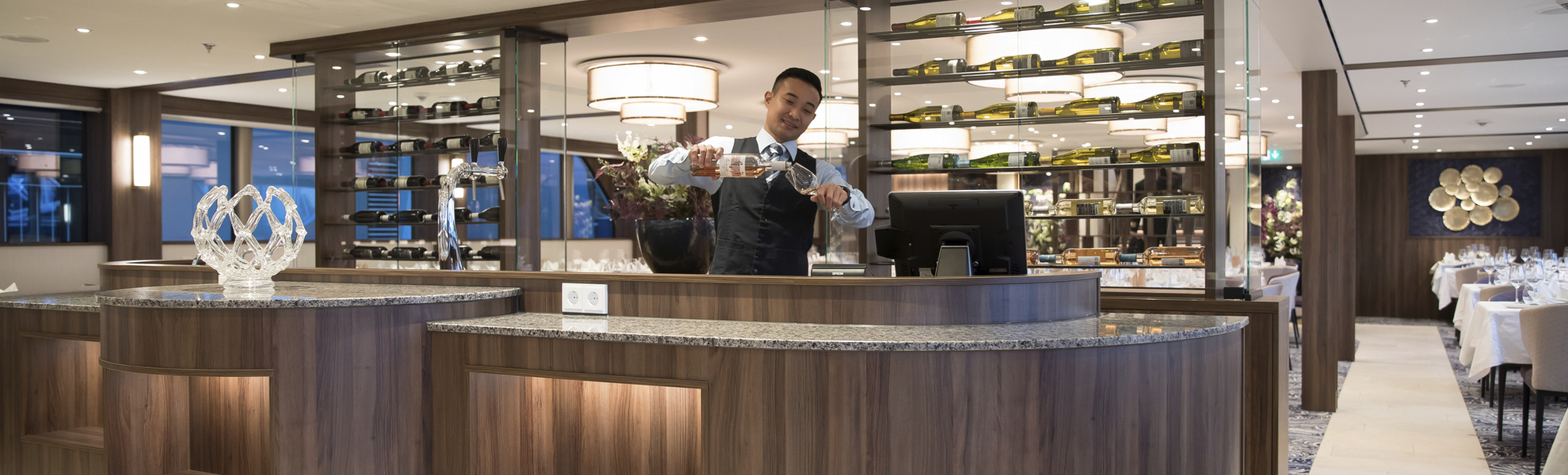 Zahlreiche Mitarbeiter in Küche und Restaurant sorgen täglich für Ihr leibliches Wohl an Bord. Genussvolle Menüs durch fest eingespielte Küchenteams werden für Sie zubereitet. "Essen, was das Herz begehrt" - Zahlreiche Mahlzeiten von früh bis spät - einschließlich Nachmittags-Kaffeezeit, Kapitänsempfang und Kapitäns-Dinner mit festlichem Menü. Essen ohne eng gefasste Essenszeiten immer in einer Tischzeit! Auf Wunsch servieren wir Ihnen auch Gerichte für spezielle Diäten (Diabetiker, Glutenfrei, Laktosefrei, Vegan etc.)