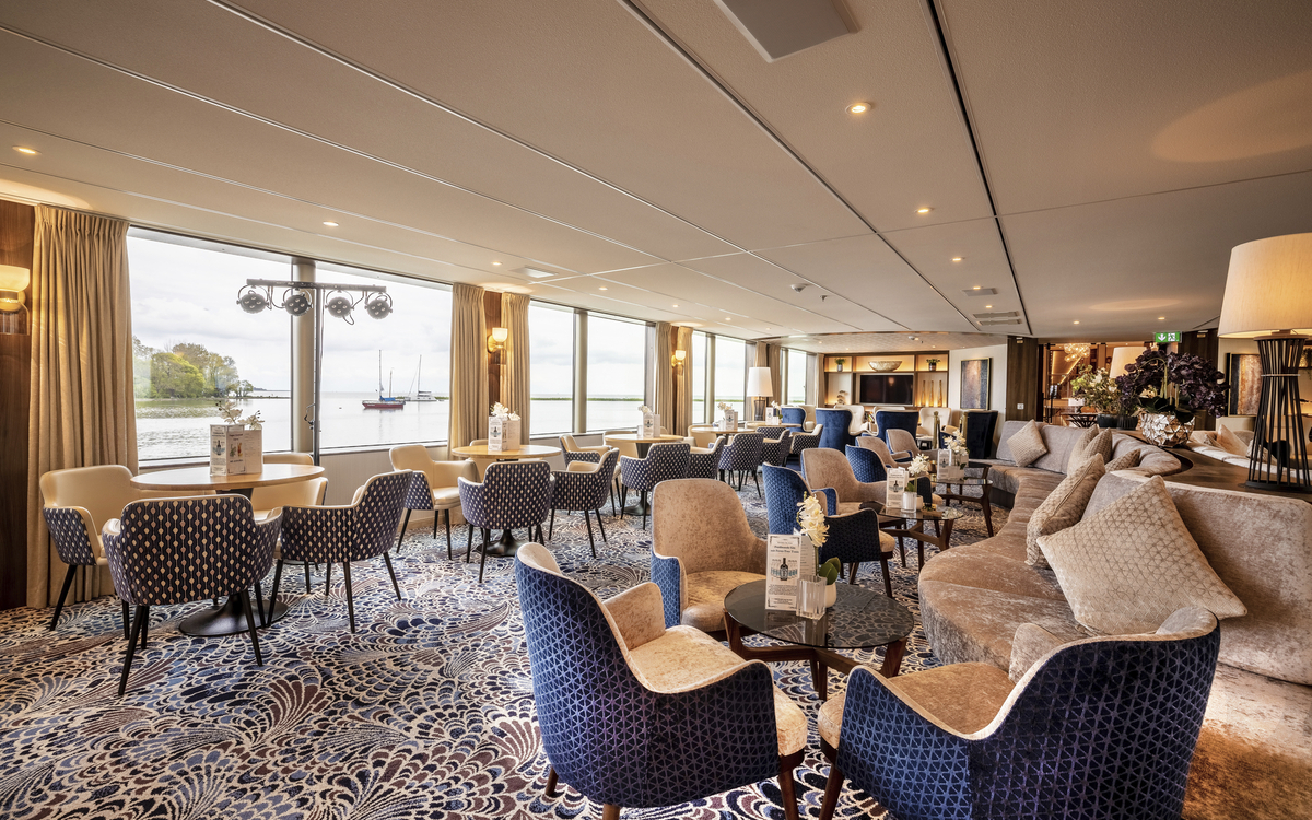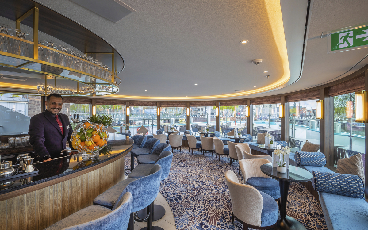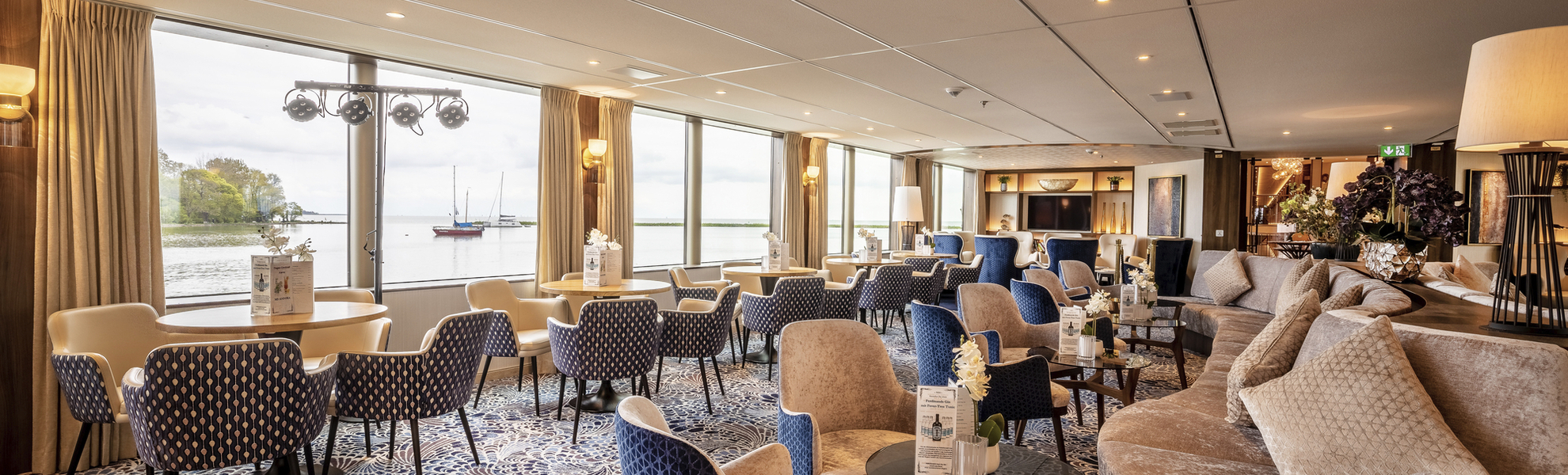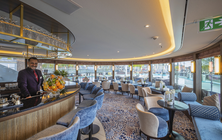 Elegante Räumlichkeiten auf 4 Passagierdecks verteilt. Stilvoll eingerichtete Panorama-Lounge mit Bar, Panorama-Restaurant ”Vier Jahreszeiten“ (eine Tischzeit), elegante Heckbar und Heckrestaurant mit Außenterrasse.