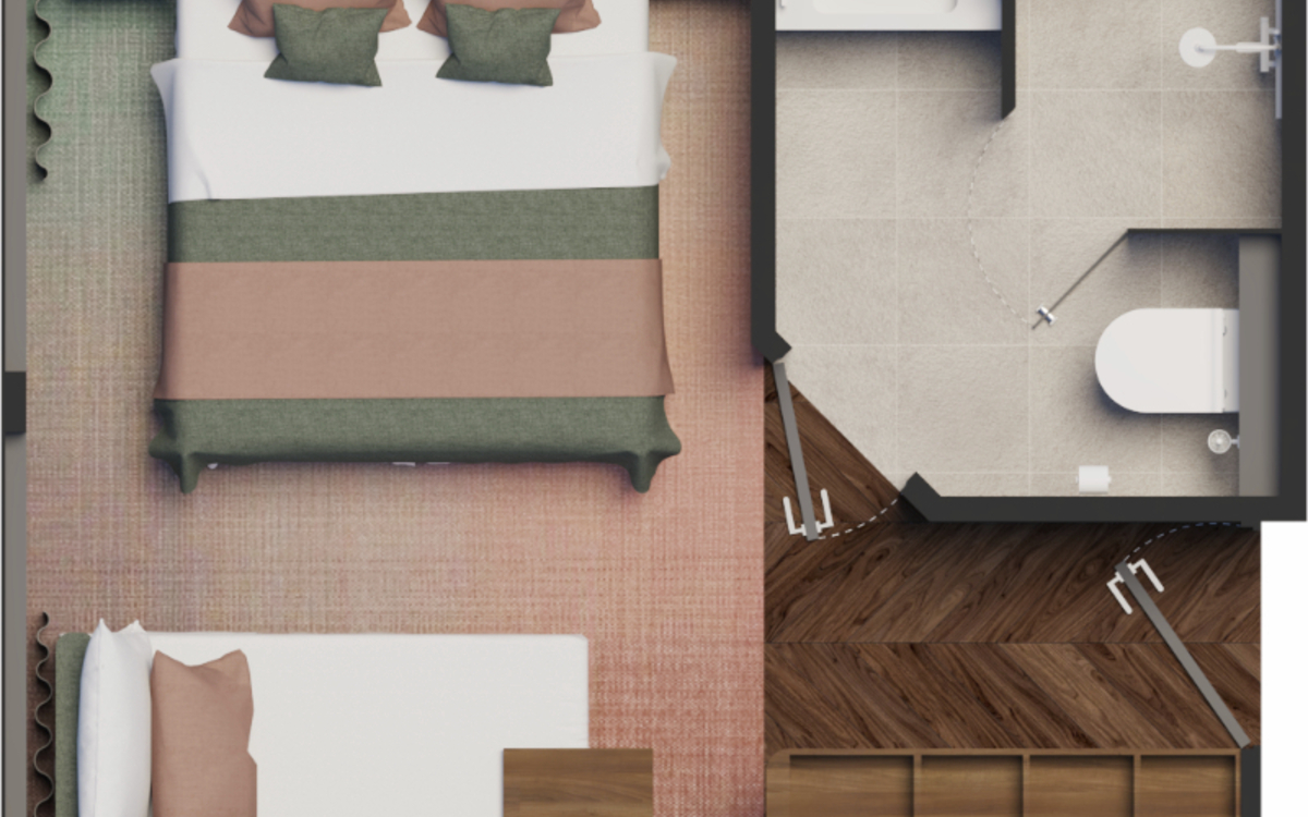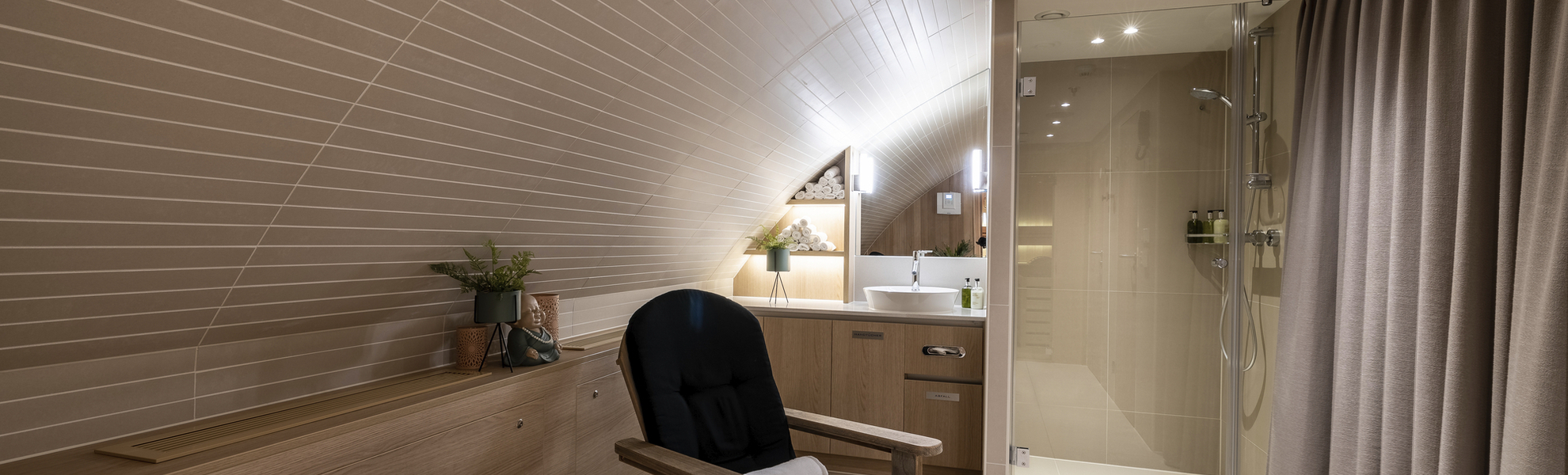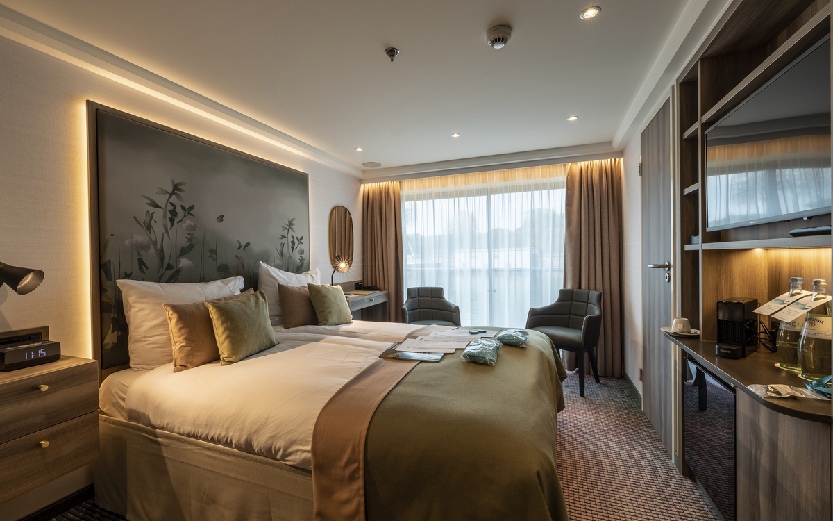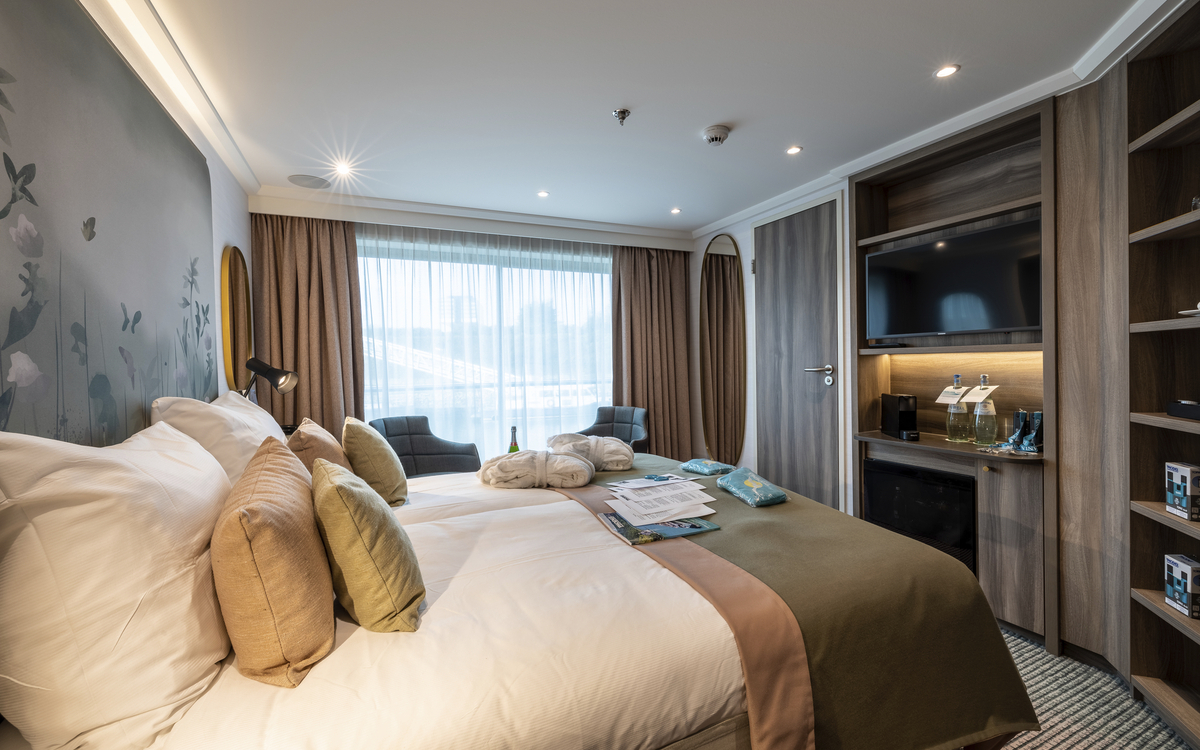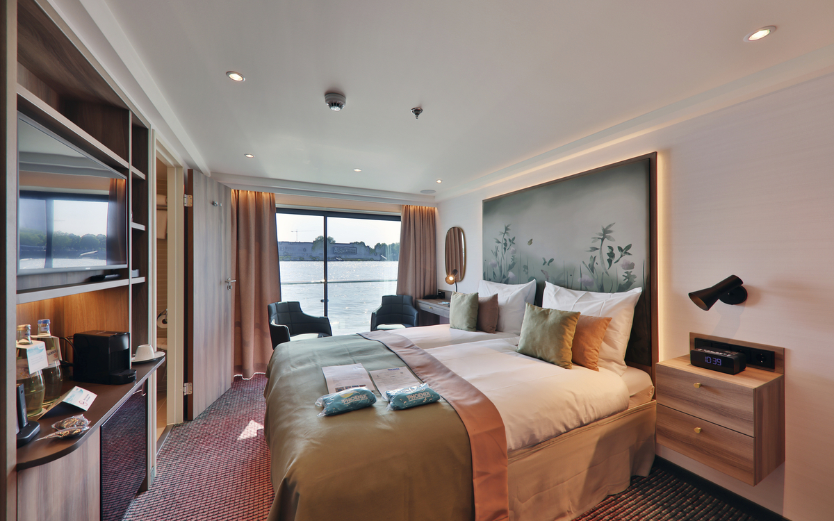 Alle Kabinen liegen außen und sind komfortabel und luxuriös eingerichtet und haben einen französischen Balkon. Die Betten lassen sich wahlweise als Doppel- oder Einzelbetten stellen.