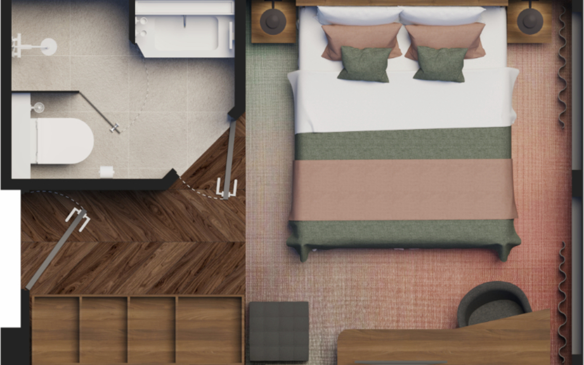 Ausstattung: Dusche/WC, Fön, individuell regulierbare Klimaanlage, SAT-TV (Flachbildschirm), Radio, Kaffeemaschine, Minibar, Safe, Telefon, Bordspannung 230 V Wechselstrom. Kabinengröße ca. 15,5 qm.