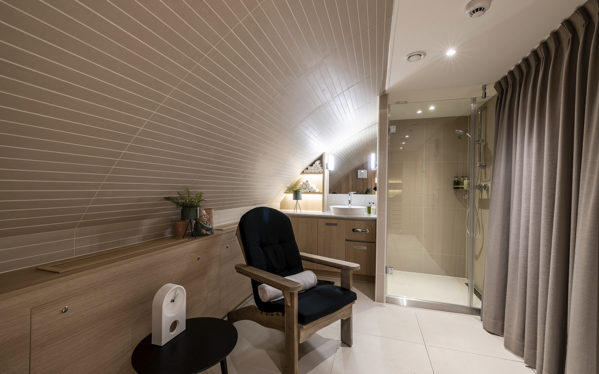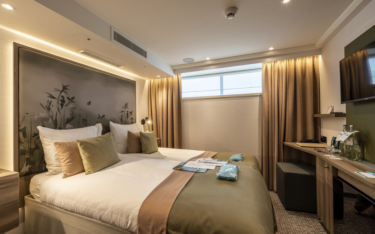 Alle Kabinen liegen außen und sind komfortabel und luxuriös eingerichtet mit kleinen Fenstern, die aus Sicherheitsgründen nicht zu öffnen sind. Die Betten lassen sich wahlweise als Doppel- oder Einzelbetten stellen.