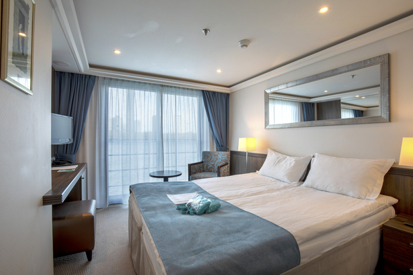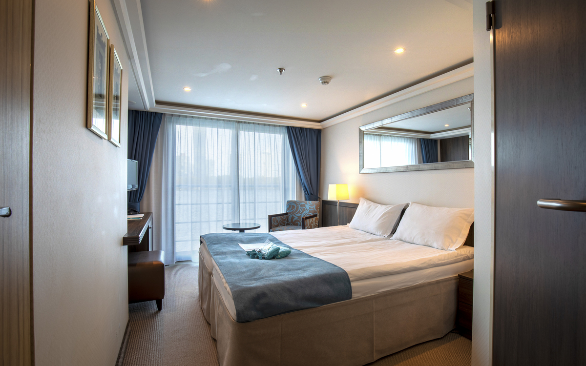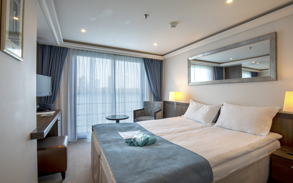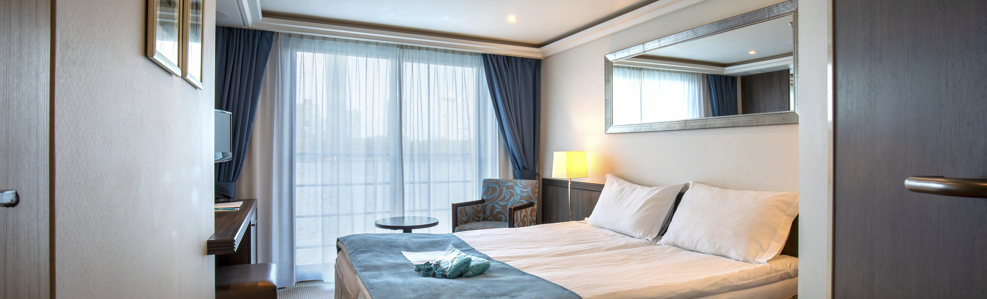Alle Kabinen liegen außen, sind komfortabel eingerichtet mit französischem Balkon. Die Betten auf dem Saturn- und Oriondeck lassen sich wahlweise als Doppel- oder Einzelbett stellen.