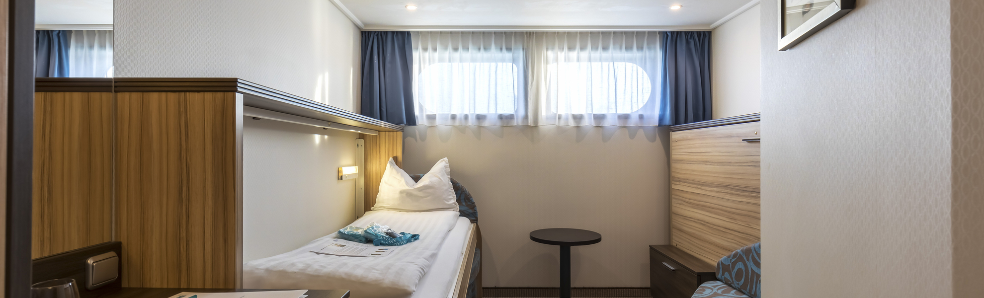 Alle Kabinen liegen außen, sind komfortabel eingerichtet, kleine Fenster (nicht zu öffnen). Die Kabinen dieser Kategorie liegen im hinteren Bereich des Schiffes, bei fahrendem Schiff verstärkte Maschinengeräusche.