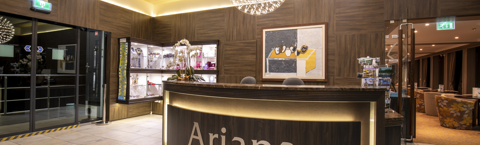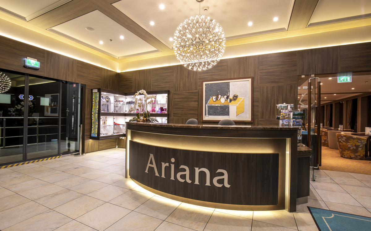 Die MS Ariana hat 4 Passagierdecks, Panorama-Restaurant (eine Tischzeit), großzügige lichtdurchflutete Panorama-Lounge mit Bar und Tanzfläche sowie Bücherei mit Leseecke, großzügiges Foyer, kleiner Bordshop an der Rezeption.