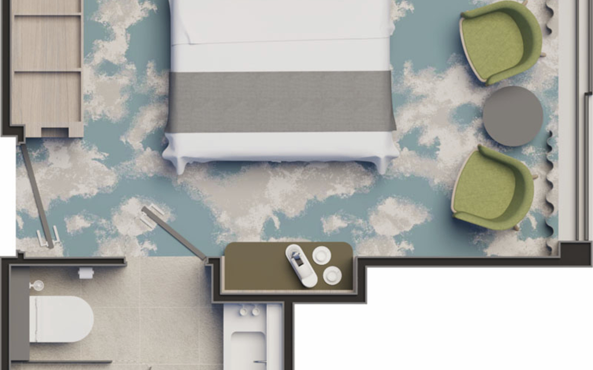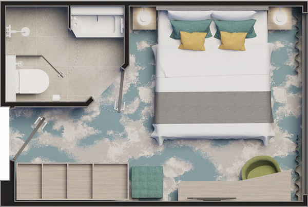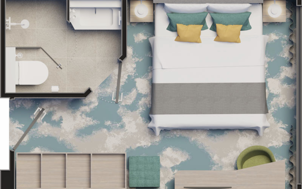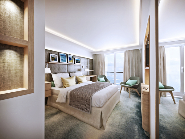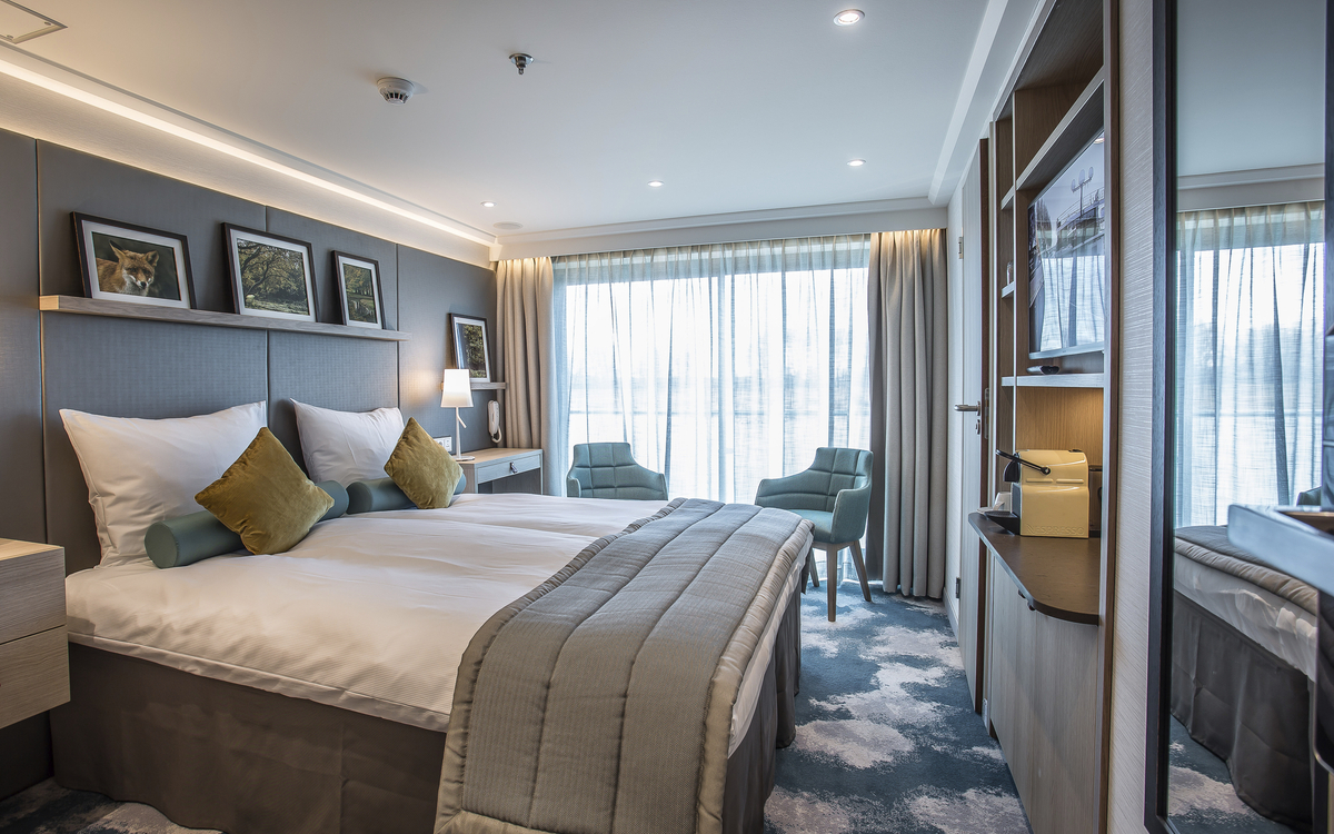 Alle Kabinen liegen außen und sind komfortabel und luxuriös eingerichtet und haben einen französischen Balkon. Die Betten lassen sich wahlweise als Doppel- oder Einzelbetten stellen.