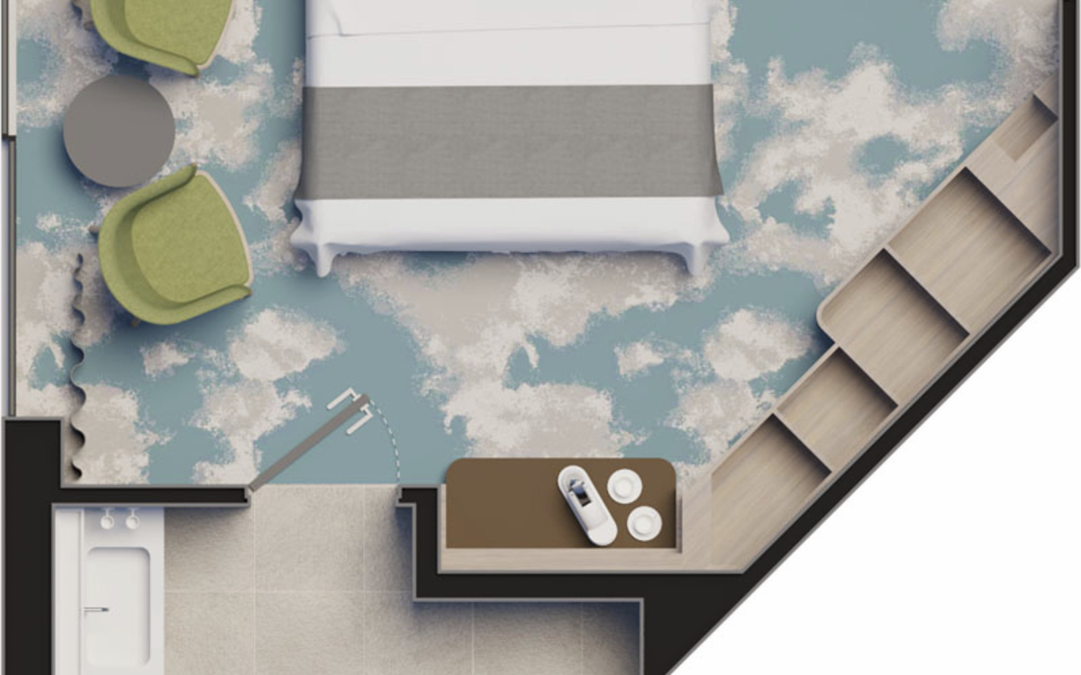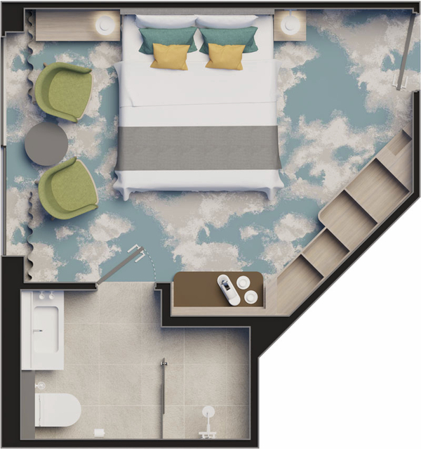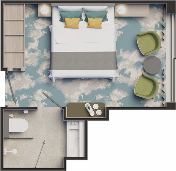 Ausstattung: Dusche/WC, Fön, individuell regulierbare Klimaanlage, SAT-TV (Flachbildschirm), Radio, Kaffeemanschine, Minibar, Safe, Telefon, Bordspannung 230 V Wechselstrom. Kabinengröße ca. 15,5 qm.
